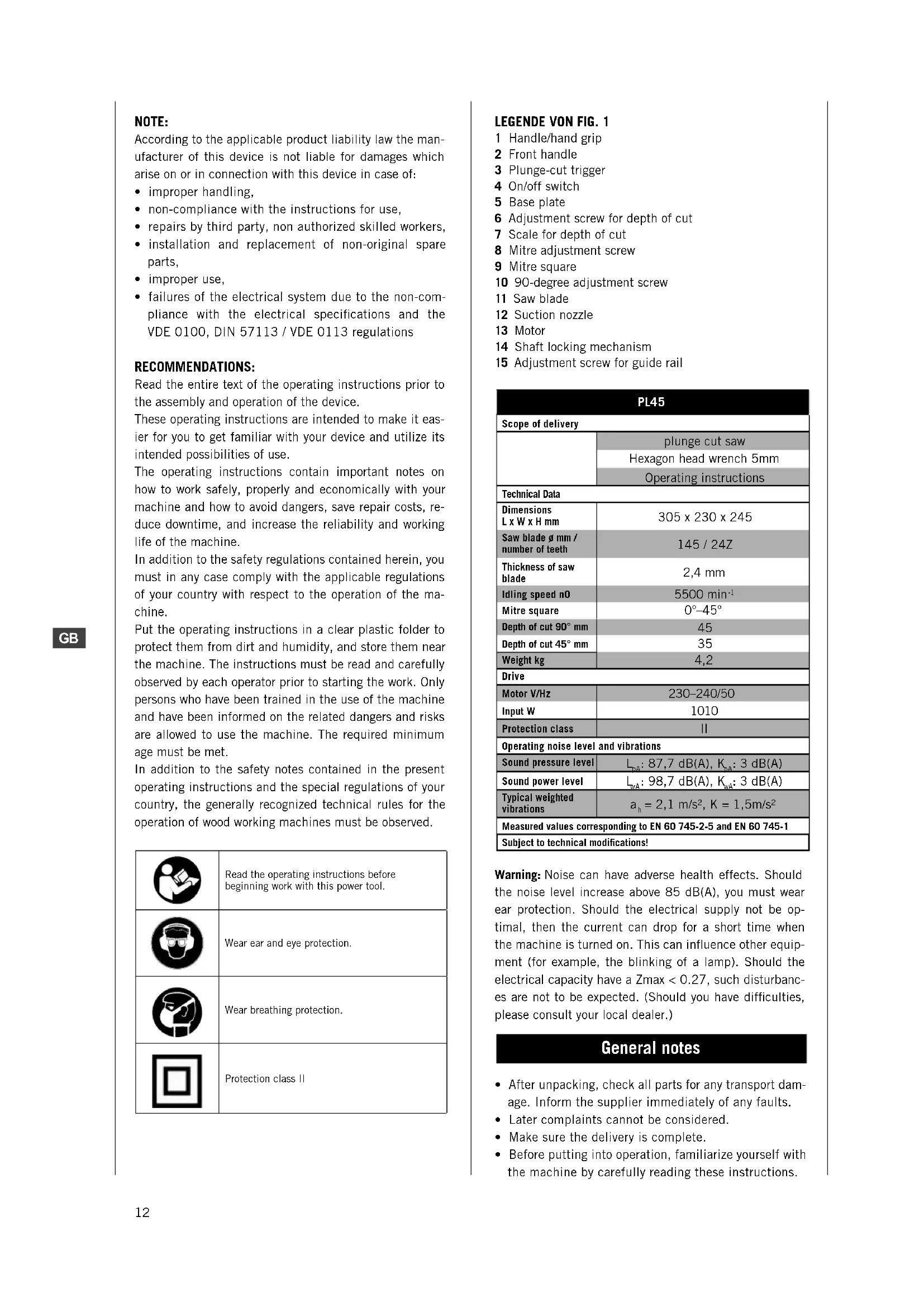 1 Handle/hand grip 2 Front handle 3 Plunge-cut trigger 4 On/off switch 5 Base plate 6 Adjustment screw for depth of cut 7 Scale for depth of cut 8 Mitre adjustment screw 9 Mitre square 10 90-degree adjustment screw 11 Saw blade 12 Suction nozzle 13 Motor 14 Shaft locking mechanism 15 Adjustment screw for guide rail PL45 Scope of delivery plunge cut saw Hexagon head wrench 5mm Operating instructions Technical DataDimensions L x W x H mm 305 x 230 x 245 Saw blade ø mm / number of teeth 145 / 24Z Thickness of saw blade 2,4 mm Idling speed n0 5500 min