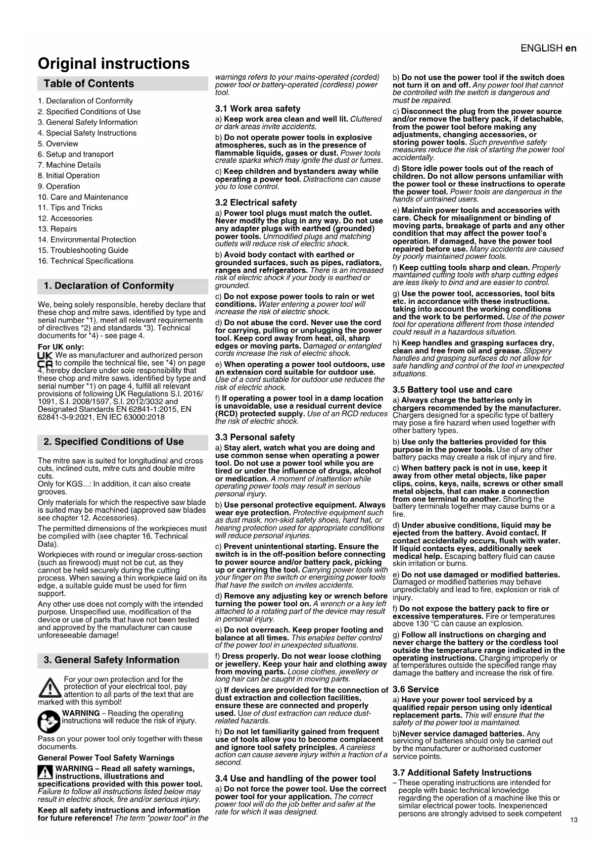 The mitre saw is suited for longitudinal and cross cuts, inclined cuts, mitre cuts and double mitre cuts. Only for KGS...: In addition, it can also create grooves. Only materials for which the respective saw blade is suited may be machined (approved saw blades see chapter 12. Accessories). The permitted dimensions of the workpieces must be complied with (see chapter 16. Technical Data). Workpieces with round or irregular cross-section (such as firewood) must not be cut, as they cannot be held securely during the cutting process. When sawing a thin workpiece laid on its edge, a suitable guide must be used for firm support. Any other use does not comply with the intended purpose. Unspecified use, modification of the device or use of parts that have not been tested and approved by the manufacturer can cause unforeseeable damage! For your own protection and for the protection of your electrical tool, pay attention to all parts of the text that are marked with this symbol! WARNING – Reading the operating instructions will reduce the risk of injury. Pass on your power tool only together with these documents. General Power Tool Safety Warnings WARNING – Read all safety warnings, instructions, illustrations and specifications provided with this power tool. Failure to follow all instructions listed below may result in electric shock, fire and/or serious injury. Keep all safety instructions and information for future reference! The term "power tool" in the warnings refers to your mains-operated (corded) power tool or battery-operated (cordless) power tool.