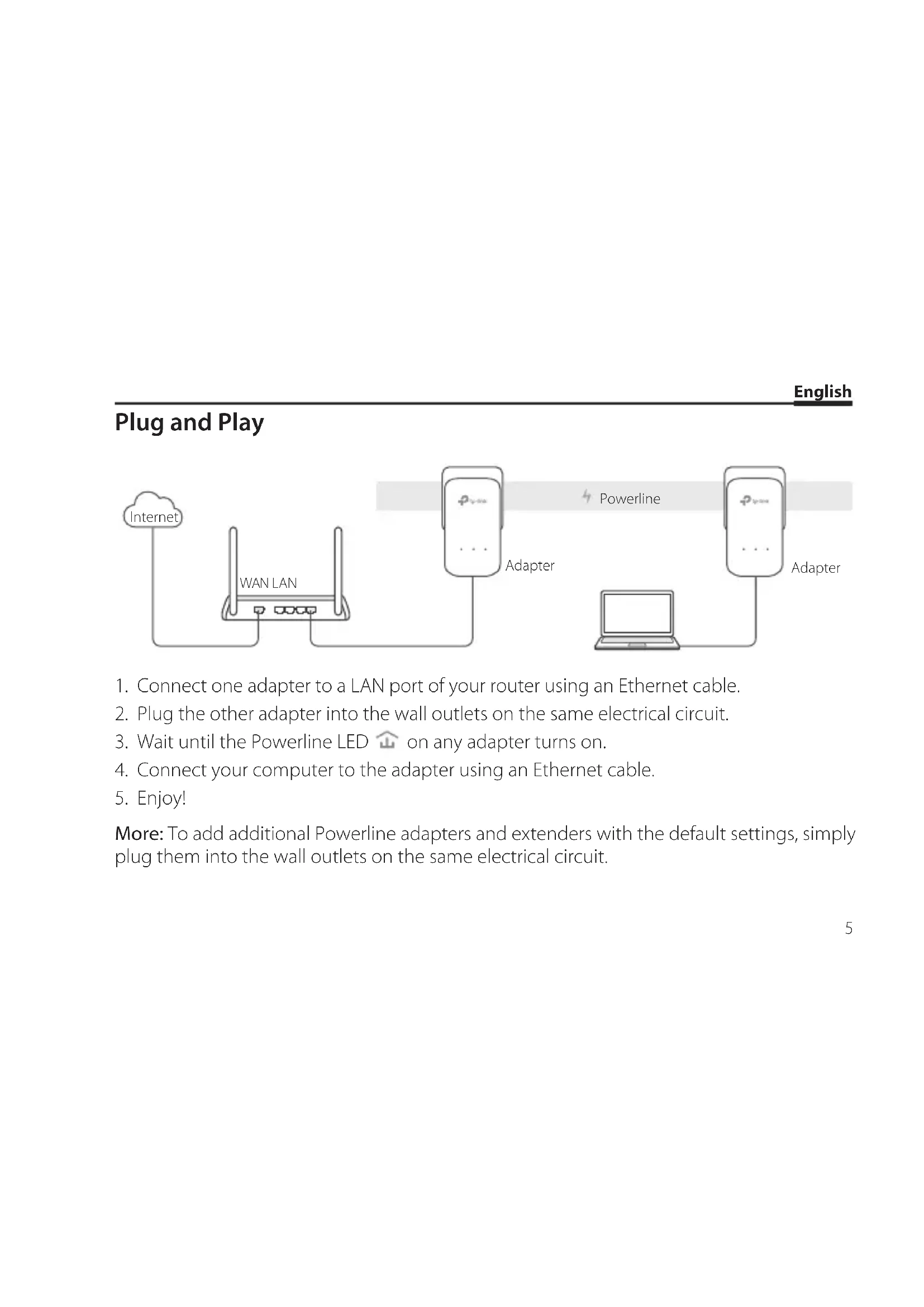 More: To add additional Powerline adapters and extenders with the default settings, simply plug them into the wall outlets on the same electrical circuit. Internet WAN LAN Adapter Adapter PowerlineEnglish