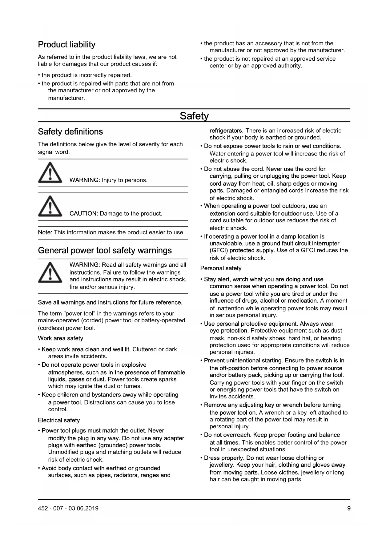 CAUTION: Damage to the product. Note: This information makes the product easier to use. General power tool safety warnings