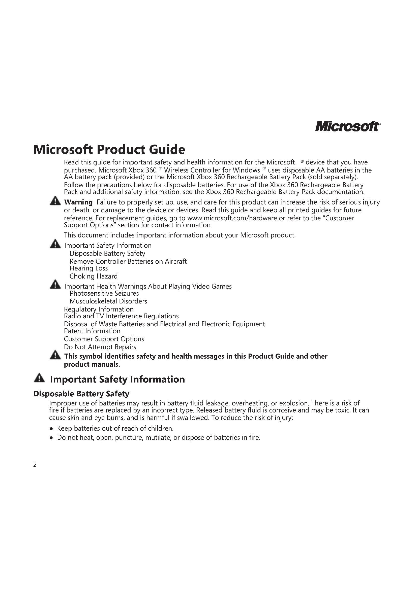 uses disposable AA batteries in the AA battery pack (provided) or the Microsoft Xbox 360 Rechargeable Battery Pack (sold separately). Follow the precautions below for disposable batteries. For use of the Xbox 360 Rechargeable Battery Pack and additional safety information, see the Xbox 360 Rechargeable Battery Pack documentation. Warning Failure to properly set up, use, and care for this product can increase the risk of serious injury or death, or damage to the device or devices. Read this guide and keep all printed guides for future reference. For replacement guides, go to www.microsoft.com/hardware or refer to the “Customer Support Options” section for contact information. This document includes important information about your Microsoft product. Important Safety Information Disposable Battery Safety Remove Controller Batteries on Aircraft Hearing Loss Choking Hazard Important Health Warnings About Playing Video Games Photosensitive Seizures Musculoskeletal Disorders Regulatory Information Radio and TV Interference Regulations Disposal of Waste Batteries and Electrical and Electronic Equipment Patent Information Customer Support Options Do Not Attempt Repairs This symbol identies safety and health messages in this Product Guide and other product manuals. Important Safety Information Disposable Battery Safety Improper use of batteries may result in battery uid leakage, overheating, or explosion. There is a risk of re if batteries are replaced by an incorrect type. Released battery uid is corrosive and may be toxic. It can cause skin and eye burns, and is harmful if swallowed. To reduce the risk of injury: ● Keep batteries out of reach of children. ● Do not heat, open, puncture, mutilate, or dispose of batteries in re.
