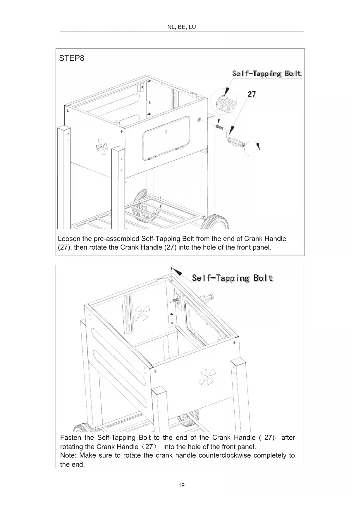Loosen the pre-assembled Self-Tapping Bolt from the end of Crank Handle (27), then rotate the Crank Handle (27) into the hole of the front panel.