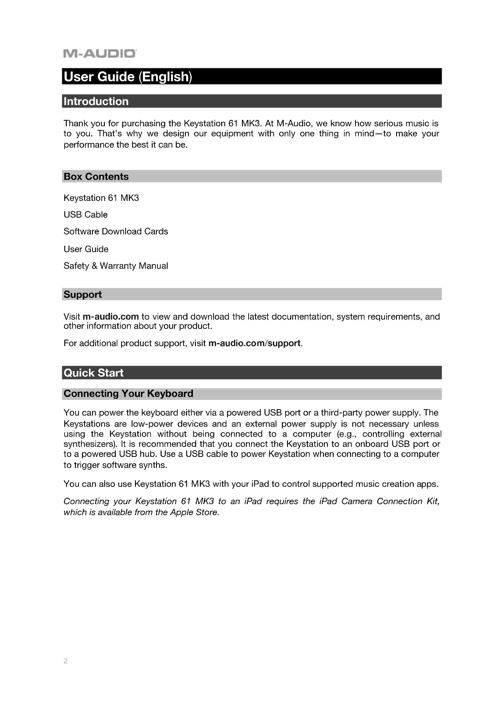 Box Contents Keystation 61 MK3 USB Cable Software Download Cards User Guide Safety & Warranty Manual Support Visit m-audio.com to view and download the latest documentation, system requirements, and other information about your product. For additional product support, visit m-audio.com/support. Quick Start Connecting Your Keyboard You can power the keyboard either via a powered USB port or a third-party power supply. The Keystations are low-power devices and an external power supply is not necessary unless using the Keystation without being connected to a computer (e.g., controlling external synthesizers). It is recommended that you connect the Keystation to an onboard USB port or to a powered USB hub. Use a USB cable to power Keystation when connecting to a computer to trigger software synths. You can also use Keystation 61 MK3 with your iPad to control supported music creation apps. Connecting your Keystation 61 MK3 to an iPad requires the iPad Camera Connection Kit, which is available from the Apple Store.3 Setup Items not listed under Introduction > Box Contents are sold separately.