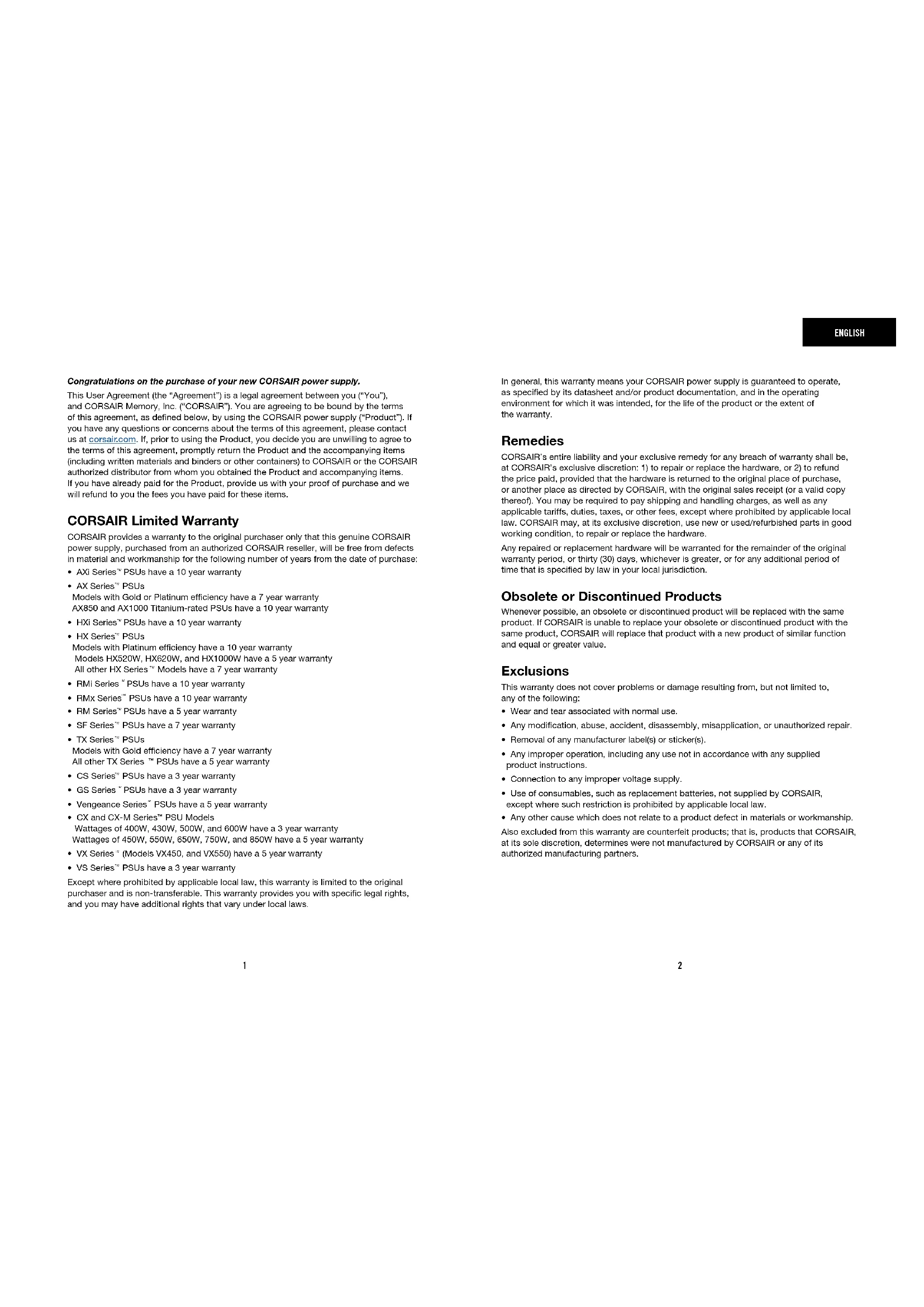 - Any other cause which does not relate to a product defect in materials or workmanship. Also excluded from this warranty are counterfeit products; that is, products that CORSAIR, at its sole discretion, determines were not manufactured by CORSAIR or any of its authorized manufacturing partners.3 4 ENGLISH Limitation of Liability CORSAIR SHALL NOT BE LIABLE FOR ANY SPECIAL, INCIDENTAL, INDIRECT, OR CONSEQUENTIAL DAMAGES WHATSOEVER, INCLUDING BUT NOT LIMITED TO LOSS OF PROFITS, REVENUE, OR DATA (WHETHER DIRECT OR INDIRECT) OR COMMERCIAL LOSS FOR BREACH OF ANY EXPRESS OR IMPLIED WARRANTY ON YOUR PRODUCT EVEN IF CORSAIR HAS BEEN ADVISED PREVIOUSLY OF THE POSSIBILITY OF SUCH DAMAGES. Some local laws do not allow the exclusion or limitation of special, indirect, incidental or consequential damages, so this limitation or exclusion may not apply in your jurisdiction. Duration of Implied Warranties EXCEPT AS PROHIBITED BY APPLICABLE LAW, ANY IMPLIED WARRANTY OR CONDITION OF MERCHANTABILITY OR FITNESS FOR A PARTICULAR PURPOSE ON THIS HARDWARE PRODUCT IS LIMITED IN DURATION TO THE DURATION OF THE APPLICABLE LIMITED WARRANTY PERIOD FOR YOUR PRODUCT. Some local laws do not allow limitations on how long an implied warranty may last, so this limitation may not apply in your jurisdiction. National Statutory Rights Consumers may have legal rights under applicable national legislation governing the sale of consumer goods. Such rights are not affected by the warranties in this Limited Warranty. No Other Warranties No CORSAIR employee, dealer, or other agent is authorized to make any modification, extension, or addition to this warranty. How to Make a Warranty Claim Before submitting a warranty claim, we suggest you contact our technical support group or visit corsair.com and review the support section for technical assistance. A simple fix for your problem may be found there. Generally, valid warranty claims should be processed through your original point of purchase during the first thirty (30) days after purchase. This period may vary depending on where you purchased your product; please verify the return policy with the retailer where you purchased your product. Any warranty claims that cannot be processed through your original point of purchase should be addressed directly to CORSAIR. Our customer service contact information can be found on the web at corsair.com/contact or in the documentation included with your product. Introduction CORSAIR power supplies are designed for worry-free compatibility for your desktop PC system build or upgrade. With the features to be expect from a premium power supply, it’s a great choice for systems where continuous and reliable power delivery and low noise are essential. Your CORSAIR power supply is packed with the latest technology and features: