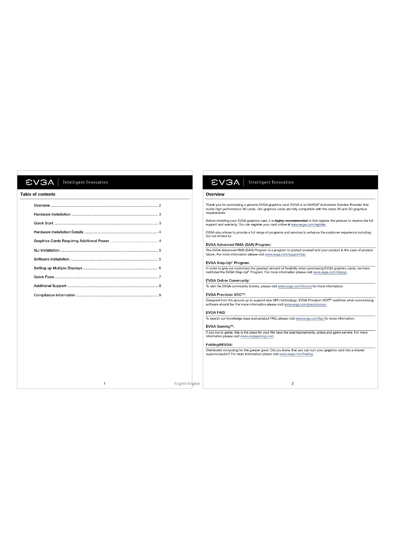 If you live to game, this is the place for you! We have the best tournaments, prizes and game servers. For more information please visit www.evgagaming.com. Folding@EVGA: Distributed computing for the greater good. Did you know that you can turn your graphics card into a shared supercomputer? For more information please visit www.evga.com/folding. English English3 4 Hardware Installation the installation procedure, consult a qualified computer technician. Damage to the system components, the graphics card, and injury to yourself may result if power is applied during installation. Now that you have prepared your computer, you are ready to install your graphics card. Quick Start