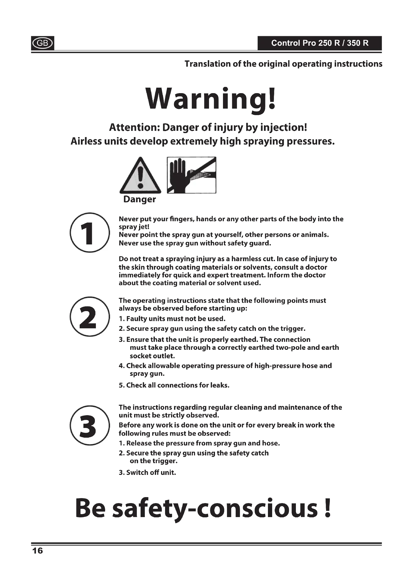 Attention: Danger of injury by injection! Airless units develop extremely high spraying pressures.