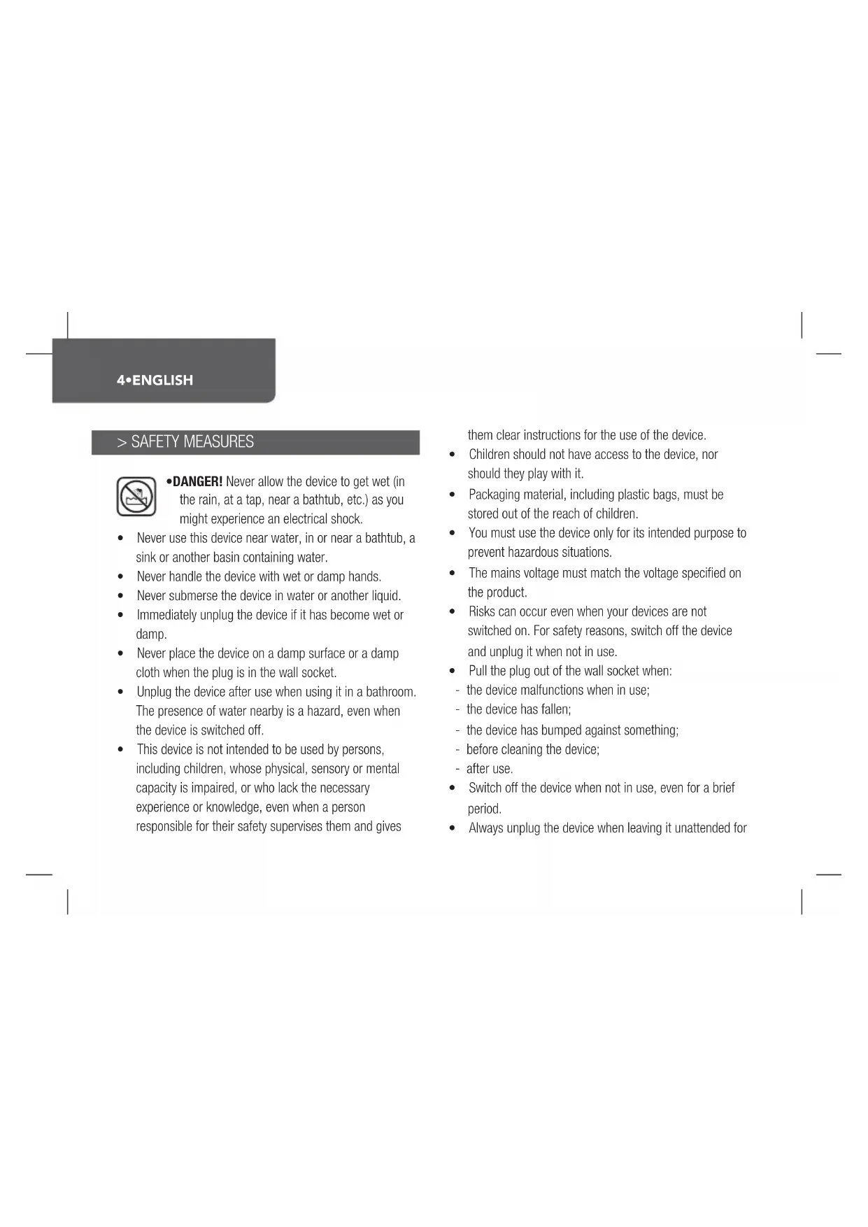 - Never place the device on a damp surface or a damp cloth when the plug is in the wall socket.