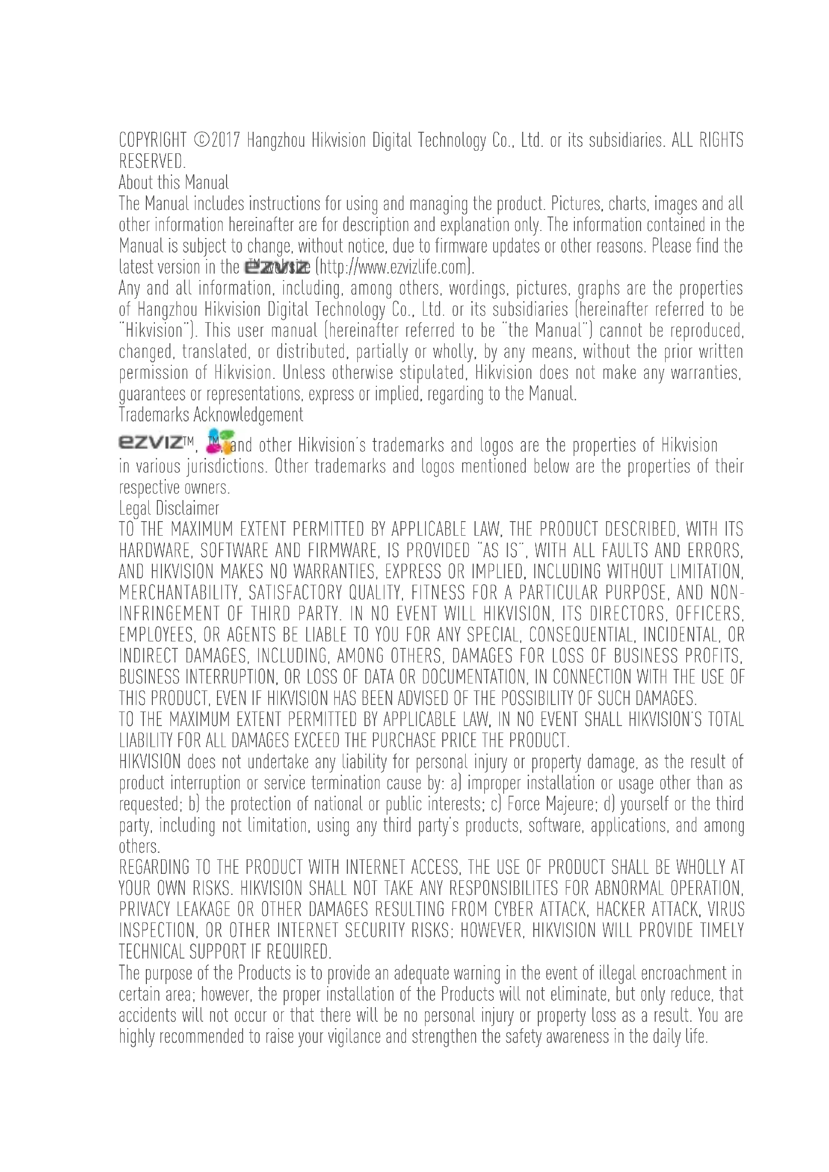 Husky Air www.ezvizlife.comCOPYRIGHT ©2017 Hangzhou Hikvision Digital Technology Co., Ltd. or its subsidiaries. ALL RIGHTS RESERVED. About this Manual The Manual includes instructions for using and managing the product. Pictures, charts, images and all other information hereinafter are for description and explanation only. The information contained in the Manual is subject to change, without notice, due to firmware updates or other reasons. Please find the latest version in the ™ website (http://www.ezvizlife.com). Any and all information, including, among others, wordings, pictures, graphs are the properties of Hangzhou Hikvision Digital Technology Co., Ltd. or its subsidiaries (hereinafter referred to be “Hikvision”). This user manual (hereinafter referred to be “the Manual”) cannot be reproduced, changed, translated, or distributed, partially or wholly, by any means, without the prior written permission of Hikvision. Unless otherwise stipulated, Hikvision does not make any warranties, guarantees or representations, express or implied, regarding to the Manual. Trademarks Acknowledgement ™, ™, and other Hikvision’s trademarks and logos are the properties of Hikvision in various jurisdictions. Other trademarks and logos mentioned below are the properties of their respective owners. Legal Disclaimer TO THE MAXIMUM EXTENT PERMITTED BY APPLICABLE LAW, THE PRODUCT DESCRIBED, WITH ITS HARDWARE, SOFTWARE AND FIRMWARE, IS PROVIDED “AS IS”, WITH ALL FAULTS AND ERRORS, AND HIKVISION MAKES NO WARRANTIES, EXPRESS OR IMPLIED, INCLUDING WITHOUT LIMITATION, MERCHANTABILITY, SATISFACTORY QUALITY, FITNESS FOR A PARTICULAR PURPOSE, AND NON- INFRINGEMENT OF THIRD PARTY. IN NO EVENT WILL HIKVISION, ITS DIRECTORS, OFFICERS, EMPLOYEES, OR AGENTS BE LIABLE TO YOU FOR ANY SPECIAL, CONSEQUENTIAL, INCIDENTAL, OR INDIRECT DAMAGES, INCLUDING, AMONG OTHERS, DAMAGES FOR LOSS OF BUSINESS PROFITS, BUSINESS INTERRUPTION, OR LOSS OF DATA OR DOCUMENTATION, IN CONNECTION WITH THE USE OF THIS PRODUCT, EVEN IF HIKVISION HAS BEEN ADVISED OF THE POSSIBILITY OF SUCH DAMAGES. TO THE MAXIMUM EXTENT PERMITTED BY APPLICABLE LAW, IN NO EVENT SHALL HIKVISION’S TOTAL LIABILITY FOR ALL DAMAGES EXCEED THE PURCHASE PRICE THE PRODUCT. HIKVISION does not undertake any liability for personal injury or property damage, as the result of product interruption or service termination cause by: a) improper installation or usage other than as requested; b) the protection of national or public interests; c) Force Majeure; d) yourself or the third party, including not limitation, using any third party’s products, software, applications, and among others. REGARDING TO THE PRODUCT WITH INTERNET ACCESS, THE USE OF PRODUCT SHALL BE WHOLLY AT YOUR OWN RISKS. HIKVISION SHALL NOT TAKE ANY RESPONSIBILITES FOR ABNORMAL OPERATION, PRIVACY LEAKAGE OR OTHER DAMAGES RESULTING FROM CYBER ATTACK, HACKER ATTACK, VIRUS INSPECTION, OR OTHER INTERNET SECURITY RISKS; HOWEVER, HIKVISION WILL PROVIDE TIMELY TECHNICAL SUPPORT IF REQUIRED. The purpose of the Products is to provide an adequate warning in the event of illegal encroachment in certain area; however, the proper installation of the Products will not eliminate, but only reduce, that accidents will not occur or that there will be no personal injury or property loss as a result. You are highly recommended to raise your vigilance and strengthen the safety awareness in the daily life.SURVEILLANCE LAWS VARY BY JURISDICTION. PLEASE CHECK ALL RELEVANT LAWS IN YOUR JURISDICTION BEFORE USING THIS PRODUCT IN ORDER TO ENSURE THAT YOUR USE CONFORMS TO THE APPLICABLE LAW. YOU FUTHER AGREE THAT THIS PRODUCT IS ONLY FOR CIVIL USE, AND HIKVISION SHALL NOT BE LIABLE IN THE EVENT THAT THIS PRODUCT IS USED WITH ILLEGITIMATE PURPOSES, SUCH AS THIRD PARTY RIGHTS INFRINGEMENT, MEDICAL TREATMENT, SAFETY EQUIPMENT OR OTHER SITUATIONS WHERE THE PRODUCT FAILURE COULD LEAD TO DEATH OR PERSONAL INJURY, OR WEAPON OF MASS DESTRUCTION, CHEMINCAL AND BIOLOGICAL WEAPON, NUCLEAR EXPLOSION, AND ANY UNSAFE NUCLEAR ENERGY USES OR ANTI-HUMANITY USAGES. YOU SHOULD UNDERTAKE ALL RESPONSIBILITIES FOR LOSSES OR DAMAGES RESULTING FROM THE ABOVE USAGES WHATSOEVER. IN THE EVENT OF ANY CONFLICTS BETWEEN THE ABOVE AND THE APPLICABLE LAW, THE LATER PREVAILS. Regulatory Information FCC Information This device complies with Part 15 of the FCC Rules. Operation is subject to the following two conditions: (1) This device may not cause harmful interference, and (2) This device must accept any interference received, including interference that may cause undesired operation. Note: This product has been tested and found to comply with the limits for a Class B digital device, pursuant to Part 15 of the FCC Rules. These limits are designed to provide reasonable protection against harmful interference in a residential installation. This product generates, uses, and can radiate radio frequency energy and, if not installed and used in accordance with the instructions, may cause harmful interference to radio communications. However, there is no guarantee that interference will not occur in a particular installation. If this product does cause harmful interference to radio or television reception, which can be determined by turning the equipment off and on, the user is encouraged to try to correct the interference by one or more of the following measures: —Reorient or relocate the receiving antenna. —Increase the separation between the equipment and receiver. —Connect the equipment into an outlet on a circuit different from that to which the receiver is connected. —Consult the dealer or an experienced radio/TV technician for help. Please take attention that changes or modification not expressly approved by the party responsible for compliance could void the user’s authority to operate the equipment. This equipment should be installed and operated with a minimum distance 20cm between the radiator and your body. This device complies with Indus