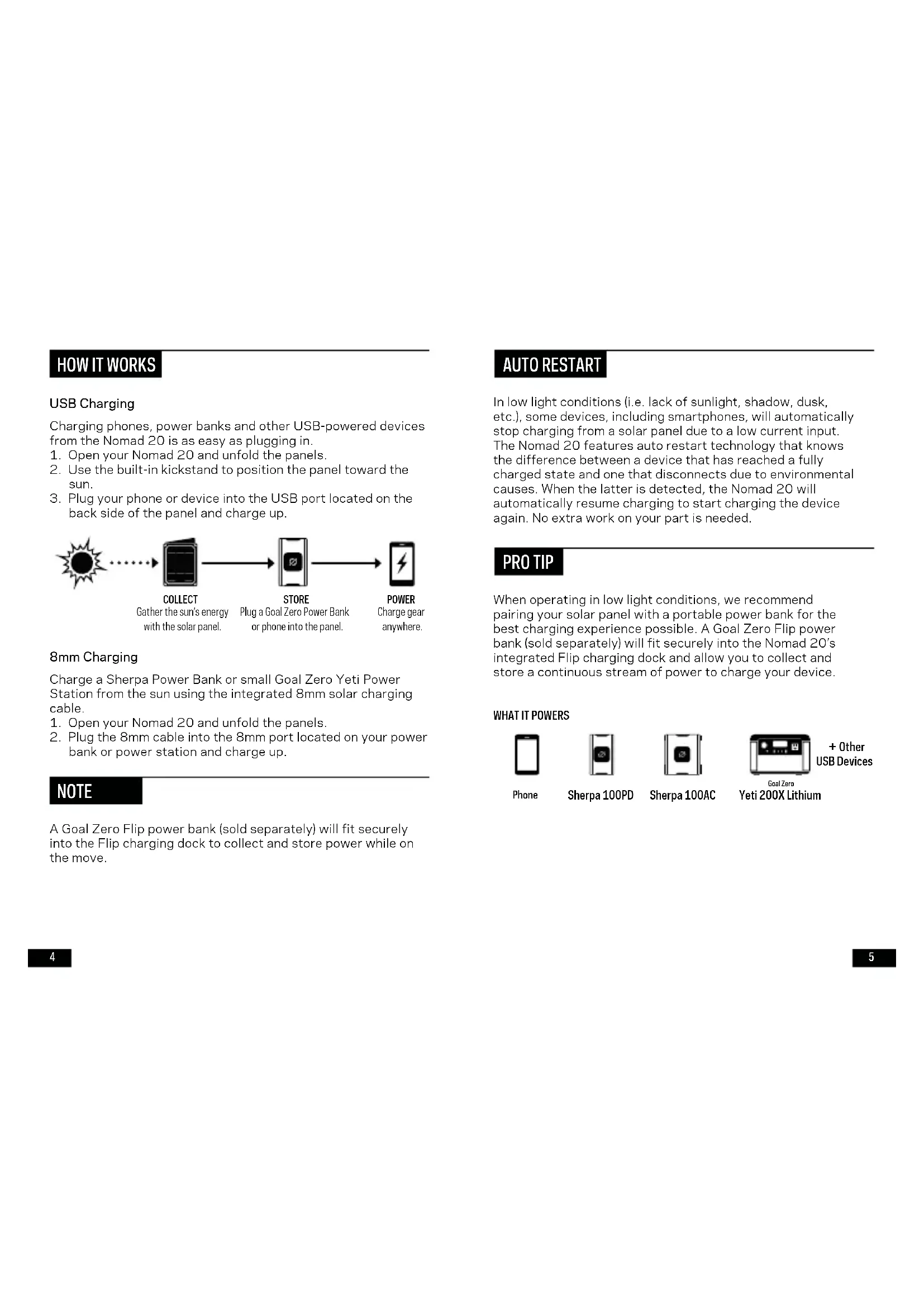 Phone Sherpa 100AC Goal Zero Yeti 200X Lithium + Other USB Devices Sherpa 100PD AUTO RESTART PRO TIP In low light conditions (i.e. lack of sunlight, shadow, dusk, etc.), some devices, including smartphones, will automatically stop charging from a solar panel due to a low current input. The Nomad 20 features auto restart technology that knows the difference between a device that has reached a fully charged state and one that disconnects due to environmental causes. When the latter is detected, the Nomad 20 will automatically resume charging to start charging the device again. No extra work on your part is needed. When operating in low light conditions, we recommend pairing your solar panel with a portable power bank for the best charging experience possible. A Goal Zero Flip power bank (sold separately) will fit securely into the Nomad 20’s integrated Flip charging dock and allow you to collect and store a continuous stream of power to charge your device.6 7 Q: Is the Nomad 20 waterproof? A: The best answer: it’s weatherproof. We’ve gone to great lengths to ruggedize the Nomad 20; including beefing up the manufacturing process with advanced lamination techniques so it’ll slough off rain and snow. Q: Does the Nomad 20 have a built-in battery? A: No. In order to make the Nomad 20 as lightweight as possible, we chose to sell batteries as an optional accessory. You can either plug your phone or device into the Nomad 20 to charge up directly from the sun, or pair the panel with one of our power banks to collect and store power for later. The Nomad 20 works seamlessly with our line of ultra-portable Flip Power Banks, versatile Sherpa Power Banks, or small Yeti Power Stations. Q: Is this chainable with other Nomad panels? A: Yes, but only on some Goal Zero Nomad Solar Panels. You can plug the Charge Cable into the chaining ports on Nomad 20 Solar Panels and larger.