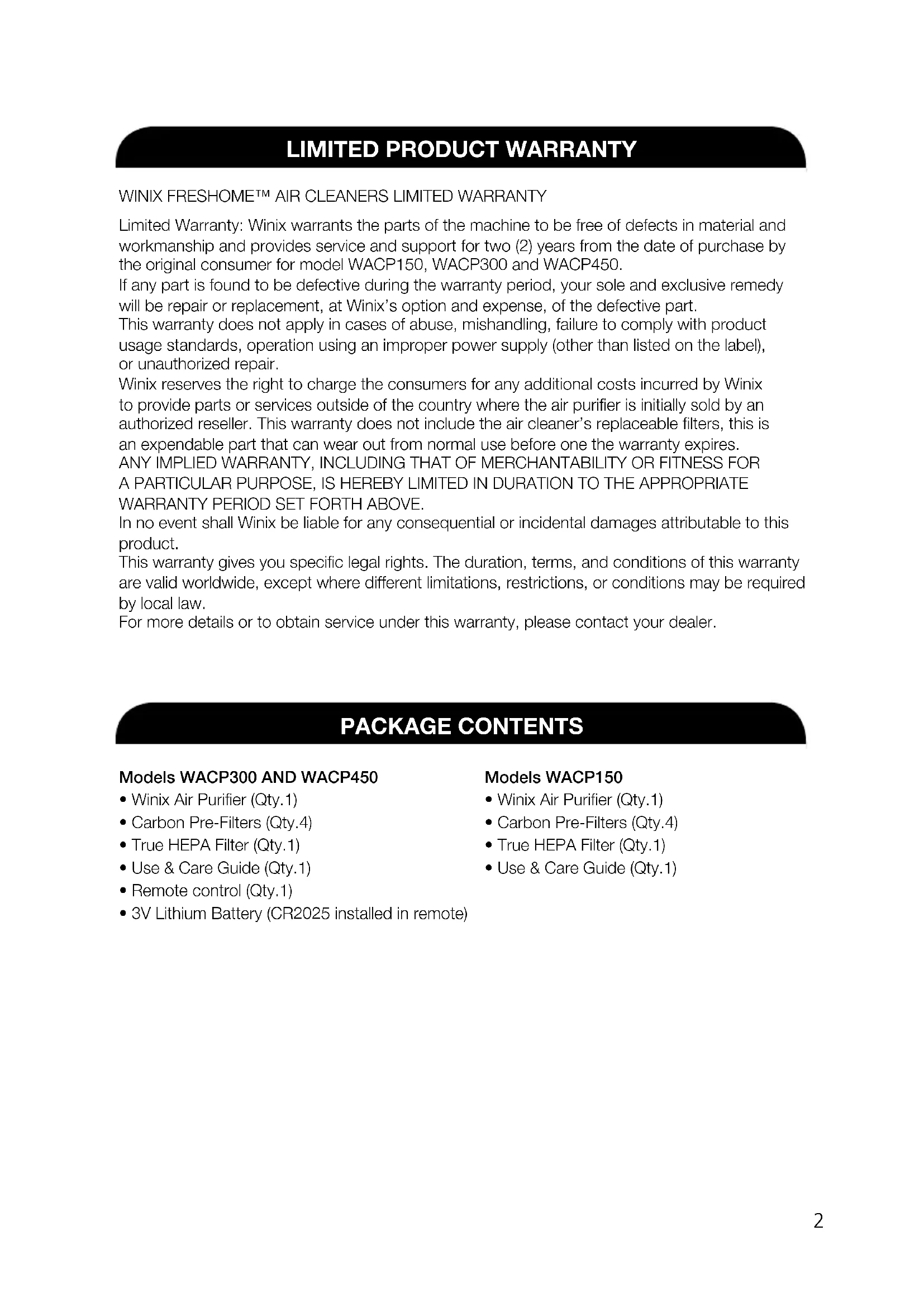 Limited Warranty: Winix warrants the parts of the machine to be free of defects in material and workmanship and provides service and support for two (2) years from the date of purchase by the original consumer for model WACP150, WACP300 and WACP450. If any part is found to be defective during the warranty period, your sole and exclusive remedy will be repair or replacement, at Winix’s option and expense, of the defective part. This warranty does not apply in cases of abuse, mishandling, failure to comply with product usage standards, operation using an improper power supply (other than listed on the label), or unauthorized repair. Winix reserves the right to charge the consumers for any additional costs incurred by Winix to provide parts or services outside of the country where the air purifier is initially sold by an authorized reseller. This warranty does not include the air cleaner’s replaceable filters, this is an expendable part that can wear out from normal use before one the warranty expires. ANY IMPLIED WARRANTY, INCLUDING THAT OF MERCHANTABILITY OR FITNESS FOR A PARTICULAR PURPOSE, IS HEREBY LIMITED IN DURATION TO THE APPROPRIATE WARRANTY PERIOD SET FORTH ABOVE. In no event shall Winix be liable for any consequential or incidental damages attributable to this product. This warranty gives you specific legal rights. The duration, terms, and conditions of this warranty are valid worldwide, except where different limitations, restrictions, or conditions may be required by local law. For more details or to obtain service under this warranty, please contact your dealer. Models WACP300 AND WACP450