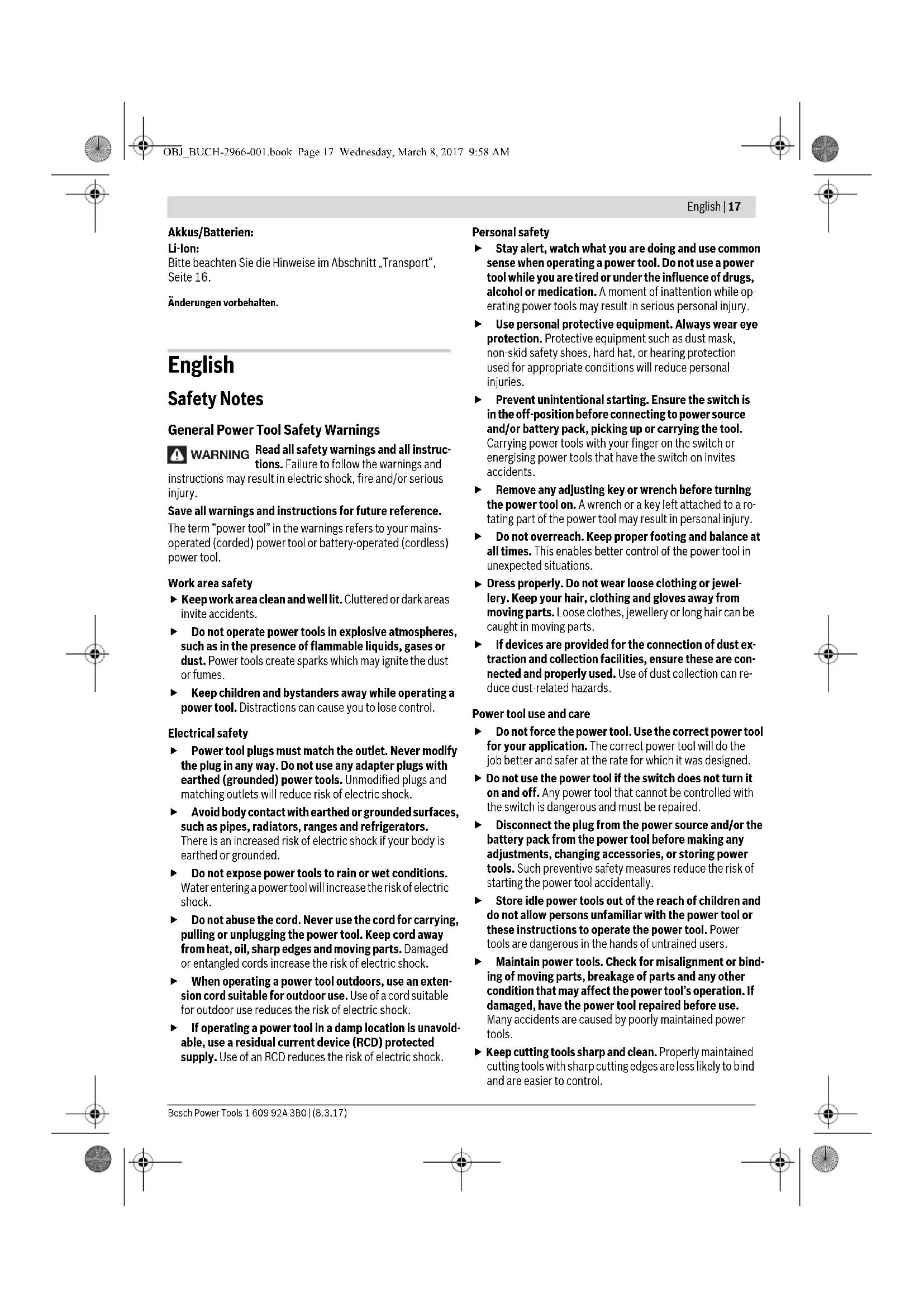 Dress properly. Do not wear loose clothing or jewel- lery. Keep your hair, clothing and gloves away from moving parts. Loose clothes, jewellery or long hair can be caugh t in moving parts. If devices are provided for the connection of dust ex- traction and collection facilities, ensure these are con- nected and properly used. Use of dust collection can re- duce dust-related hazards. Power tool use and care Do not force the power tool. Use the correct power tool for your application. The correct power tool will do the job better and safer at the rate for which it was designed. Do not use the power tool if the switch does not turn it on and off. Any power tool that cannot be controlled with the switch is dangerous and must be repaired. Disconnect the plug from the power source and/or the battery pack from the power tool before making any adjustments, changing accessories, or storing power tools. Such preventive safety measures reduce the risk of starting the power tool accidentally. Store idle power tools out of the reach of children and do not allow persons unfamiliar with the power tool or these instructions to operate the power tool. Power tools are dangerous in the hands of untrained users. Maintain power tools. Check for misalignment or bind- ing of moving parts, breakage of parts and any other condition that may affect the power tool’s operation. If damaged, have the power tool repaired before use. Many accidents are caused by poorly maintained power tools. Keep cutting tools sharp and clean. Properly maintained cutting tools with sharp cutting edges are less likely to bind and are easier to control. WARNING OBJ_BUCH-2966-001.book Page 17 Wednesday, March 8, 2017 9:58 AM18 | English 1 609 92A 3B0 | (8.3.17) Bosch Power Tools Use the power tool, accessories and tool bits etc. in ac- cordance with these instructions, taking into account the working conditions and the work to be performed. Use of the power tool for operations different from those intended could result in a hazardous situation. Battery tool use and care Recharge only with the charger specified by the manu- facturer. A charger that is suitable for one type of battery pack may create a risk of fire when used with another bat- tery pack. Use power tools only with specifically designated bat- tery packs. Use of any other battery packs may create a risk of injury and fire. When battery pack is not in use, keep it away from oth- er metal objects, like paper clips, coins, keys, nails, screws or other small metal objects, that can make a connection from one terminal to another. Shorting the battery terminals together may cause burns or a fire. Under abusive conditions, liquid may be ejected from the battery; avoid contact. If contact accidentally oc- curs, flush with water. If liquid contacts eyes, addition- ally seek medical help. Liquid ejected from the battery may cause irritation or burns. Service Have your power tool serviced by a qualified repair per- son using only identical replacement parts. This will en- sure that the safety of the power tool is maintained. Safety Warnings for cordless Multifunction Tools Hold power tool by insulated gripping surfaces, when performing an operation where the cutting accessory may contact hidden wiring. Cutting accessory contacting a “live” wire may make exposed metal parts of the power tool “live” and could give the operator an electric shock. Use the machine only for dry sanding. Penetration of wa- ter into the machine increases the risk of an electric shock. Caution, fire hazard! Avoid overheating the object be- ing sanded as well as the sander. Always empty the dust collector before taking breaks. In unfavourable conditions, e.g., when sparks emit from sanding metals, sanding debris in the dust bag, micro filter or paper sack (or in the filter sack or filter of the vacuum cleaner) can self-ignite. Particularly when mixed with remainders of var- nish, polyurethane or other chemical materials and when the sanding debris is hot after long periods of working. Keep hands away from the sawing range. Do not reach under the workpiece. Contact with the saw blade can lead to injuries. Use appropriate detectors to determine if utility lines are hidden in the work area or call the local utility compa- ny for assistance. Contact with electric lines can lead to fire and electric shock. Damaging a gas line can lead to explo- sion. Penetrating a water line causes property damage. When working with the machine, always hold it firmly with both hands and provide for a secure stance. The power tool is guided more secure with both hands. Secure the workpiece. A workpiece clamped with clamp- ing devices or in a vice is held more secure than by hand. Do not open the battery. Danger of short-circuiting. Protect the battery against heat, e.g., against continuous intense sunlight, fire, water, and moisture. Danger of explosion. In case of damage and improper use of the battery, vapours may be emitted. Ventilate the area and seek medical help in case of complaints. The vapours can irri- tate the respiratory system. Use the battery only in conjunction with your Bosch power tool. This measure alone protects the battery against dangerous overload. The battery can be damaged by pointed objects such as nails or screwdrivers or by force applied externally. An internal short circuit can occur and the battery can burn, smoke, explode or overheat. Wear protective gloves when changing application tools/accessories. Application tools/accessories become hot after prolonged usage. Do not scrape wetted materials (e.g. wallpaper) or on moist surfaces. Penetration of water into the machine in- creases the risk of an electric shock. Do not treat the surface to be worked with solvent-con- taining fluids. Materials being warmed up by the scraping can cause toxic vapours to develop. Exercise extreme caution when handling the scraper. The accessory is very sharp; danger of injury. Product Description and Specifications R