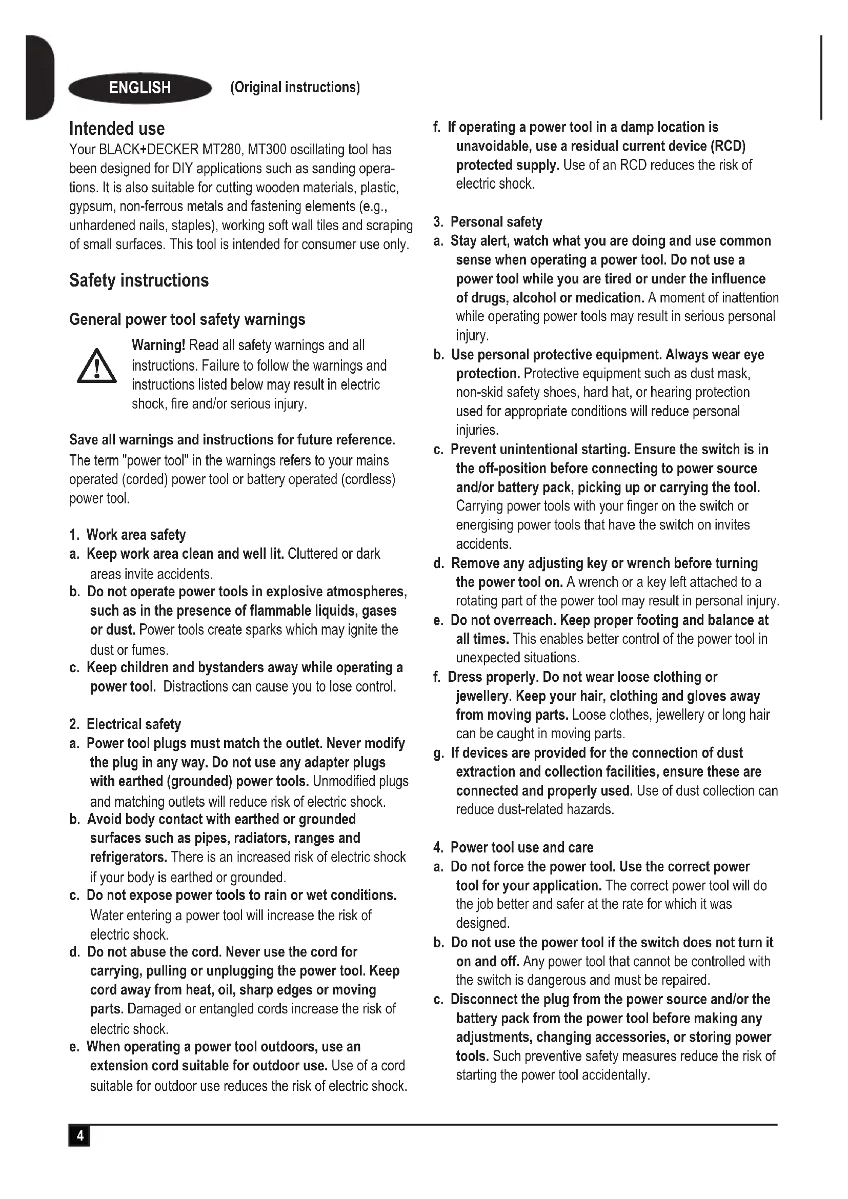 ENGLISH (Original instructions) Intended use Your BLACK+DECKER MT280, MT300 oscillating tool has been designed for DIY applications such as sanding opera- tions. It is also suitable for cutting wooden materials, plastic, gypsum, non-ferrous metals and fastening elements (e.g., unhardened nails, staples), working soft wall tiles and scraping of small surfaces. This tool is intended for consumer use only. Safety instructions General power tool safety warnings