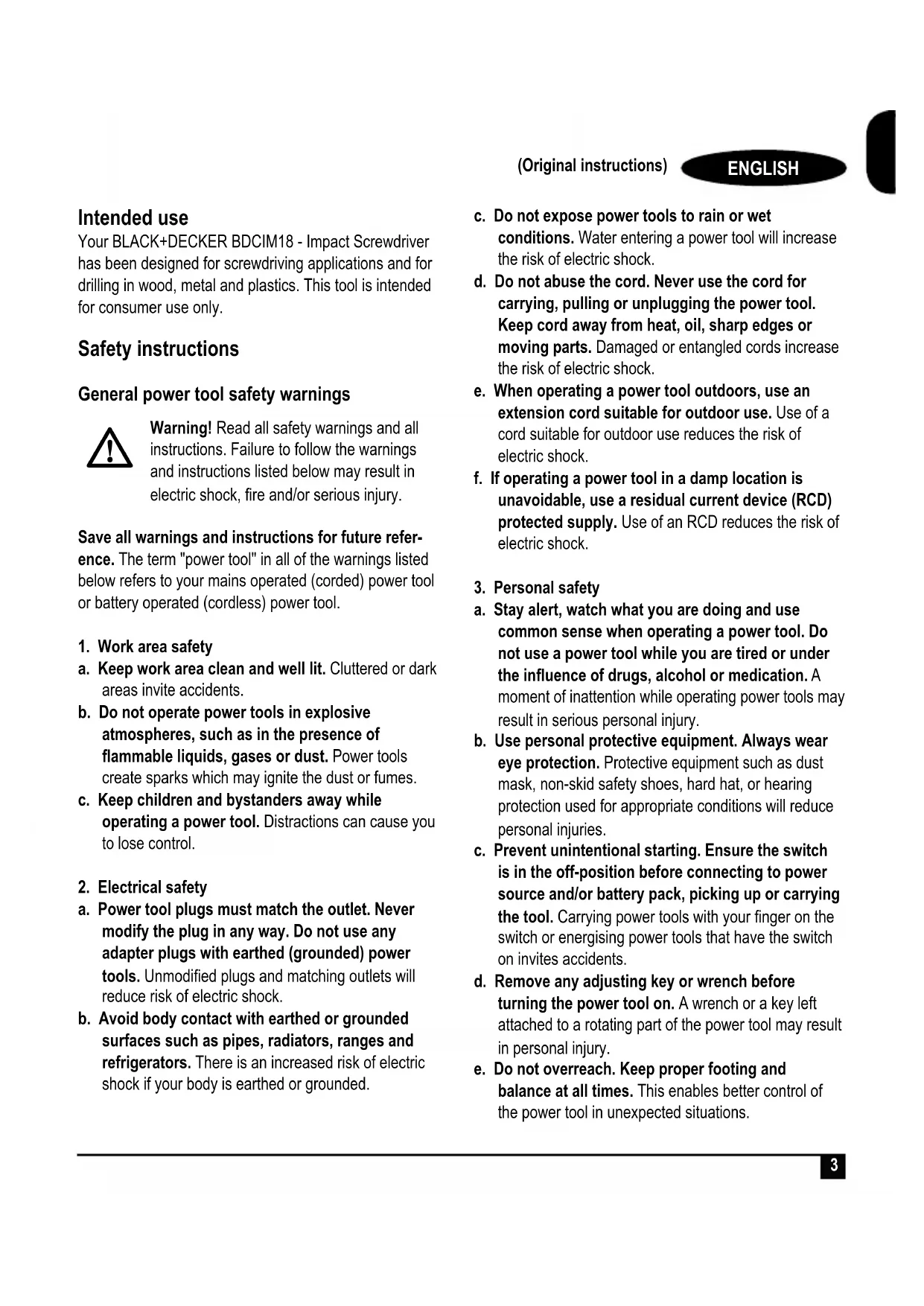 Intended use Your BLACK+DECKER BDCIM18 - Impact Screwdriver has been designed for screwdriving applications and for drilling in wood, metal and plastics. This tool is intended for consumer use only. Safety instructions General power tool safety warnings