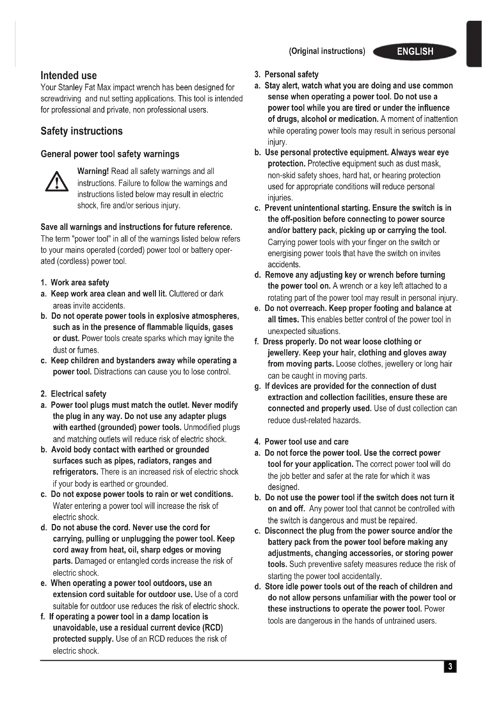 ENGLISH (Original instructions) Intended use Your Stanley Fat Max impact wrench has been designed for screwdriving and nut setting applications. This tool is intended for professional and private, non professional users. Safety instructions General power tool safety warnings