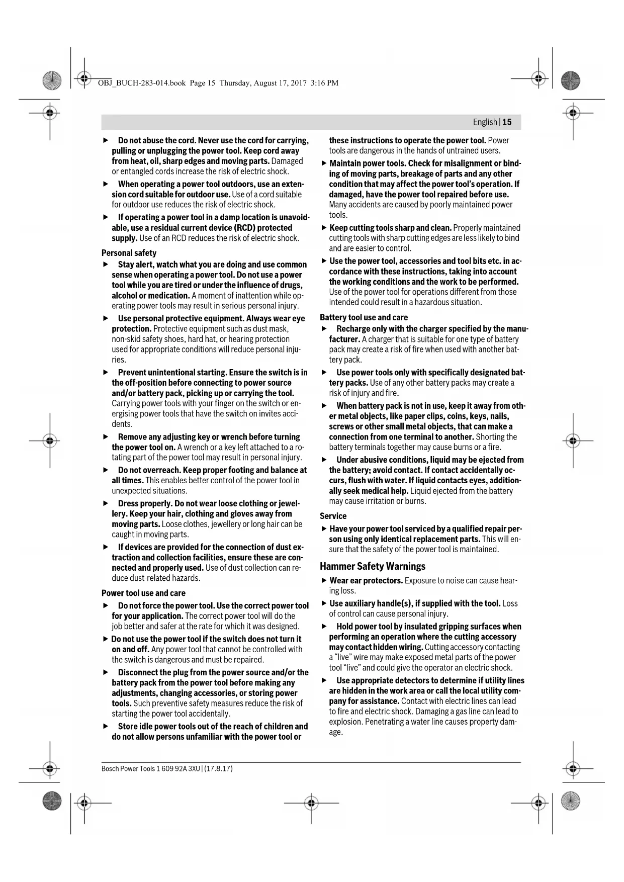 Changing the position of the auxiliary handle (see figure B) The auxiliary handle 16 can be set to any position for a secure and low-fatigue working posture. – Turn the bottom part of the auxiliary handle 16 in counter- clockwise direction and swivel the auxiliary handle 16 to the desired position. Then retighten the bottom part of the auxiliary handle 16 by turning in clockwise direction. Pay attention that the clamping band of the auxiliary handle is positioned in the groove on the housing as intended for. Selecting Drill Chucks and Tools For hammer drilling and chiselling, SDS-plus tools are re- quired that are inserted in the SDS-plus drill chuck. For drilling without impact in wood, metal, ceramic and plas- tic as well as for screwdriving, tools without SDS-plus are used (e.g., drill bits with cylindrical shank). For these tools, a keyless chuck or a key type drill chuck are required. Inserting/Removing the Key Type Drill Chuck (GBH 36 VF-LI Plus) To work with tools without SDS-plus (e.g., drills with cylindri- cal shank), a suitable drill chuck must be mounted (key type drill chuck or keyless chuck, accessories). Mounting the Key Type Drill Chuck (see figure C) – Screw the SDS-plus adapter shank 24 into a key type drill chuck 23. Secure the key type drill chuck 23 with the se- curing screw 22. Please observe that the securing screw has a left-hand thread. Inserting the Key Type Drill Chuck (see figure C) – Clean the shank end of the adapter shank and apply a light coat of grease. – Insert the key type drill chuck with the adapter shank into the tool holder with a turning motion until it automatically locks. – Check the locking effect by pulling the key type drill chuck. Removing the Key Type Drill Chuck – Push the locking sleeve 5 toward the rear and pull out the key type drill chuck 23. Removing/Inserting the Quick Change Chuck (GBH 36 VF-LI Plus) The SDS-plus quick change chuck 2 can easily be replaced against the quick change keyless chuck 1 provided. Removing the Quick Change Chuck (see figure D) – Pull the lock ring for the quick change chuck 6 toward the rear, hold it in this position and pull off the SDS-plus quick change chuck 2 or the quick change keyless chuck 1 to- ward the front. – After removing, protect the replacement chuck against contamination. Inserting the Quick Change Chuck (see figure E) Use only model-specific original equipment and pay at- tention to the number of identification grooves 26. On- ly quick-change chucks with two or three identification grooves are permitted. When an unsuitable quick-change chuck is used, the application tool could fall out during op- eration. – Before inserting, clean the quick change chuck and apply a light coat of grease to the shank end. – Grasp the SDS-plus quick change chuck 2 or the quick change keyless chuck 1 completely with your hand. Slide the quick change chuck with a turning motion onto the drill chuck mounting 25 until a distinct latching noise is heard. – The quick change chuck is automatically locked. Check the locking effect by pulling the quick change chuck. LED Capacity Continuous lighting 3 x green ≥ 2/3 Continuous lighting 2 x green ≥ 1/3 Continuous lighting 1 x green <1/3 Flashing light 1 x green Reserve OBJ_BUCH-283-014.book Page 18 Thursday, August 17, 2017 3:16 PMEnglish | 19 Bosch Power Tools 1 609 92A 3XU | (17.8.17) Changing the Tool The dust protection cap 4 largely prevents the entry of drilling dust into the tool holder during operation. When inserting the tool, take care that the dust protection cap 4 is not damaged. A damaged dust protection cap should be changed im- mediately. We recommend having this carried out by an after-sales service. Changing the Tool (SDS-plus) Inserting SDS-plus Drilling Tools (see figure F) The SDS-plus drill chuck allows for simple and convenient changing of drilling tools without the use of additional tools. – GBH 36 VF-LI Plus: Insert the SDS-plus quick change chuck 2. – Clean and lightly grease the shank end of the tool. – Insert the tool in a twisting manner into the tool holder until it latches itself. – Check the latching by pulling the tool. As a requirement of the system, the SDS-plus drilling tool can move freely. This causes a certain radial run-out at no-load, which has no effect on the accuracy of the drill hole, as the drill bit centres itself upon drilling. Removing SDS-plus Drilling Tools (see figure G) – Push back the locking sleeve 5 and remove the tool. Changing the Tool (without SDS-plus) (GBH 36 VF-LIPlus) Inserting (see figure H) Note: Do not use tools without SDS-plus for hammer drilling or chiselling! Tools without SDS-plus and their drill chucks are damaged by hammer drilling or chiselling. – Insert a key type drill chuck 23 (see “Inserting/Removing the Key Type Drill Chuck”, page 18). – Open the key type drill chuck 23 by turning until the tool can be inserted. Insert the tool. – Insert the chuck key into the corresponding holes of the key type drill chuck 23 and clamp the tool uniformly. – Turn the mode selector switch 13 to the “drilling” position. Removing (see figure I) – Turn the sleeve of the key type drill chuck 23 with the drill chuck key in anticlockwise direction until the drilling tool can be removed. Changing the Tool (without SDS-plus) (GBH 36 VF-LIPlus) Inserting (see figure J) Note: Do not use tools without SDS-plus for hammer drilling or chiselling! Tools without SDS-plus and their drill chucks are damaged by hammer drilling or chiselling. – Insert the quick change keyless chuck 1. – Firmly hold the retaining ring 29 of the quick change chuck. Open the tool holder by turning the front sleeve 28 until the tool can be inserted. Tightly hold the retaining ring 29 and firmly turn the front sleeve 28 in the direction of the arrow until a distinct latching noise can be heard. – Check the tight seating by pulling the tool. Note: If the tool holder was opened to the stop, then t
