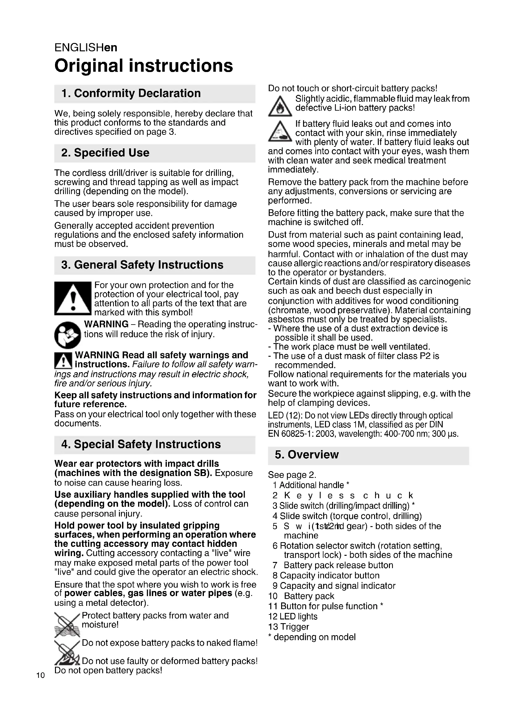 Original instructions We, being solely responsible, hereby declare that this product conforms to the standards and directives specified on page 3. The cordless drill/driver is suitable for drilling, screwing and thread tapping as well as impact drilling (depending on the model). The user bears sole responsibility for damage caused by improper use. Generally accepted accident prevention regulations and the enclosed safety information must be observed. For your own protection and for the protection of your electrical tool, pay attention to all parts of the text that are marked with this symbol! WARNING – Reading the operating instruc- tions will reduce the risk of injury. WARNING Read all safety warnings and instructions. Failure to follow all safety warn- ings and instructions may result in electric shock, fire and/or serious injury. Keep all safety instructions and information for future reference. Pass on your electrical tool only together with these documents. Wear ear protectors with impact drills (machines with the designation SB). Exposure to noise can cause hearing loss. Use auxiliary handles supplied with the tool (depending on the model). Loss of control can cause personal injury. Hold power tool by insulated gripping surfaces, when performing an operation where the cutting accessory may contact hidden wiring. Cutting accessory contacting a "live" wire may make exposed metal parts of the power tool "live" and could give the operator an electric shock. Ensure that the spot where you wish to work is free of power cables, gas lines or water pipes (e.g. using a metal detector). Protect battery packs from water and moisture! Do not expose battery packs to naked flame! Do not use faulty or deformed battery packs! Do not open battery packs! Do not touch or short-circuit battery packs! Slightly acidic, flammable fluid may leak from defective Li-ion battery packs! If battery fluid leaks out and comes into contact with your skin, rinse immediately with plenty of water. If battery fluid leaks out and comes into contact with your eyes, wash them with clean water and seek medical treatment immediately. Remove the battery pack from the machine before any adjustments, conversions or servicing are performed. Before fitting the battery pack, make sure that the machine is switched off. Dust from material such as paint containing lead, some wood species, minerals and metal may be harmful. Contact with or inhalation of the dust may cause allergic reactions and/or respiratory diseases to the operator or bystanders. Certain kinds of dust are classified as carcinogenic such as oak and beech dust especially in conjunction with additives for wood conditioning (chromate, wood preservative). Material containing asbestos must only be treated by specialists. - Where the use of a dust extraction device is possible it shall be used. - The work place must be well ventilated. - The use of a dust mask of filter class P2 is recommended. Follow national requirements for the materials you want to work with. Secure the workpiece against slipping, e.g. with the help of clamping devices. LED (12): Do not view LEDs directly through optical instruments, LED class 1M, classified as per DIN EN 60825-1: 2003, wavelength: 400-700 nm; 300 µs. See page 2. 1 Additional handle * 2Keyless chuck 3 Slide switch (drilling/impact drilling) * 4 Slide switch (torque control, drilling) 5Switch (1st/2nd gear) - both sides of the machine 6 Rotation selector switch (rotation setting, transport lock) - both sides of the machine
