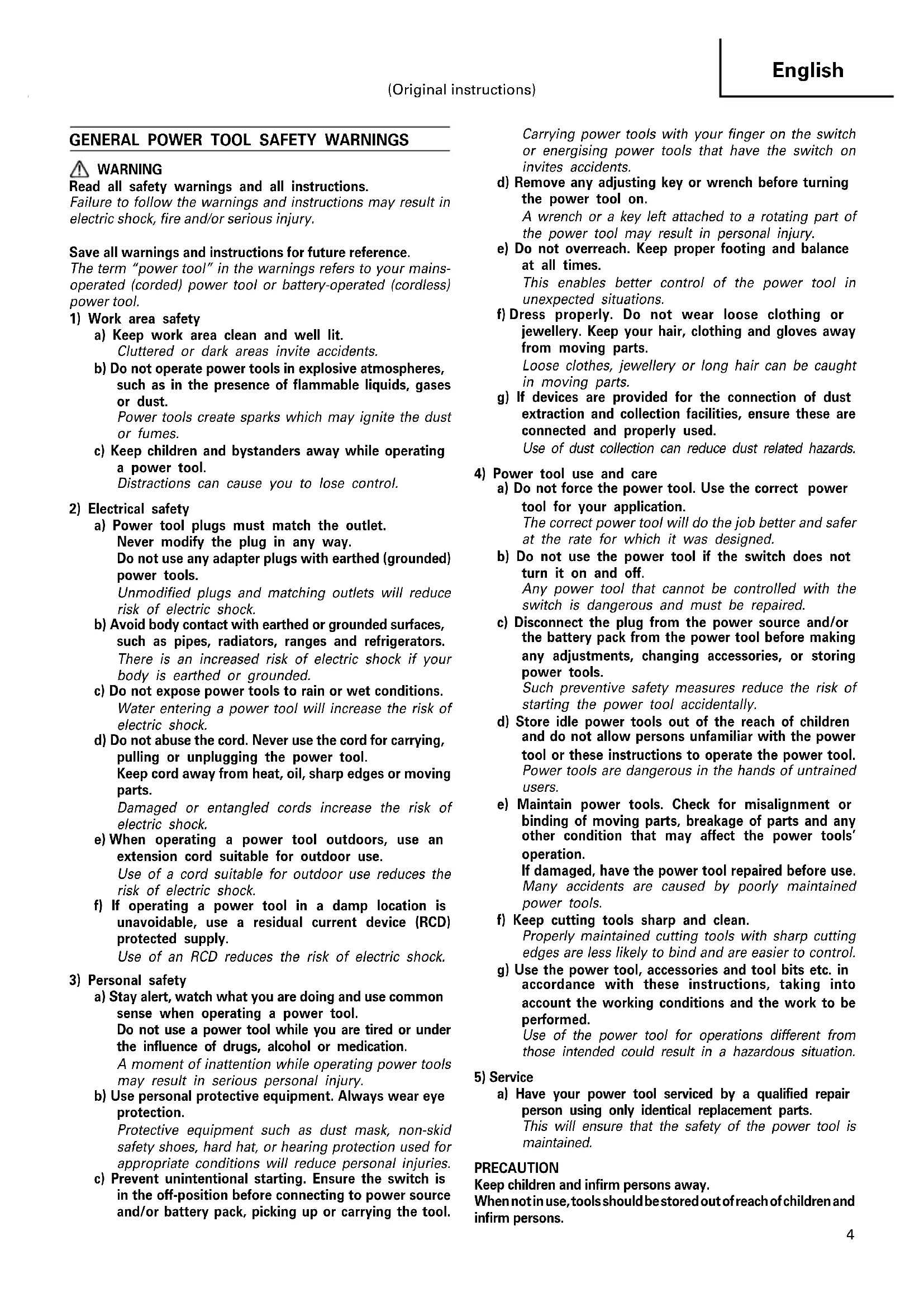 a) Have your power tool serviced by a qualified repair person using only identical replacement parts. This will ensure that the safety of the power tool is maintained. PRECAUTION Keep children and infirm persons away. When not in use, tools should be stored out of reach of children and infirm persons. (Original instructions) 01Eng_SB10V2_WE 2/23/12, 3:50 PM45 English