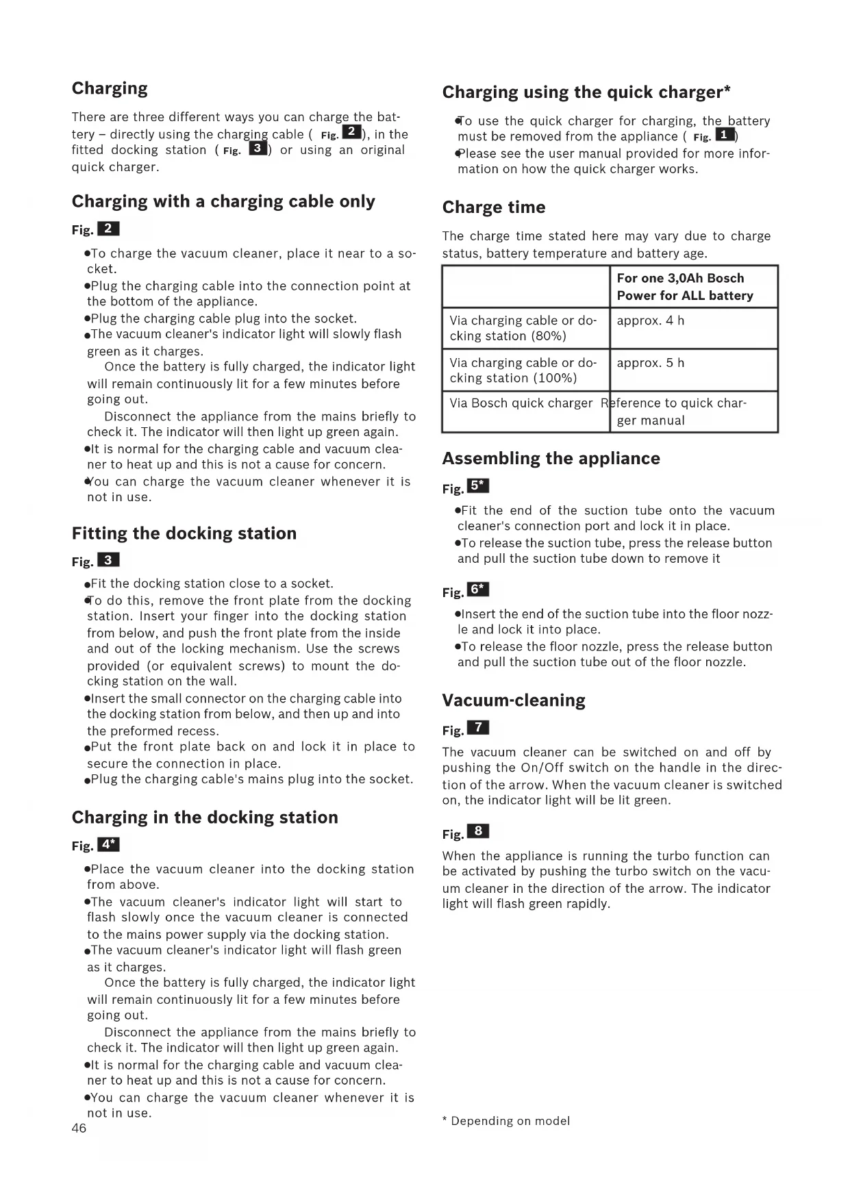 Please see the user manual provided for more infor- mation on how the quick charger works. Charge time The charge time stated here may vary due to charge status, battery temperature and battery age. For one 3,0Ah Bosch Power for ALL battery Via charging cable or do- cking station (80%) approx. 4 h Via charging cable or do- cking station (100%) approx. 5 h Via Bosch quick charger Reference to quick char- ger manual Assembling the appliance Fig.