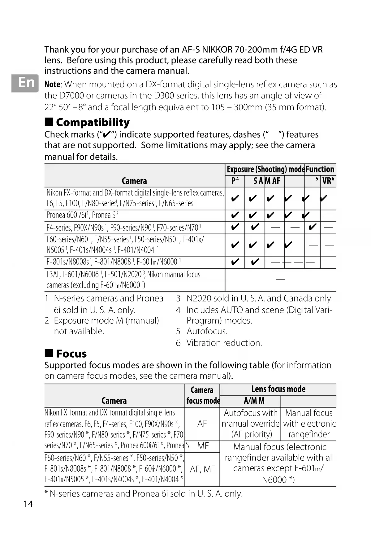 Thank you for your purchase of an AF‑S NIKKOR 70‑200mm f/4G ED VR lens. Before using this product, please carefully read both these instructions and the camera manual. Note: When mounted on a DX-format digital single-lens reflex camera such as the D7000 or cameras in the D300 series, this lens has an angle of view of 22° 50′ – 8° and a focal length equivalent to 105 – 300 mm (35 mm format). Compatibility Check marks (“✔“) indicate supported features, dashes (“—”) features that are not supported. Some limitations may apply; see the camera manual for details. Camera Exposure (Shooting) mode Function