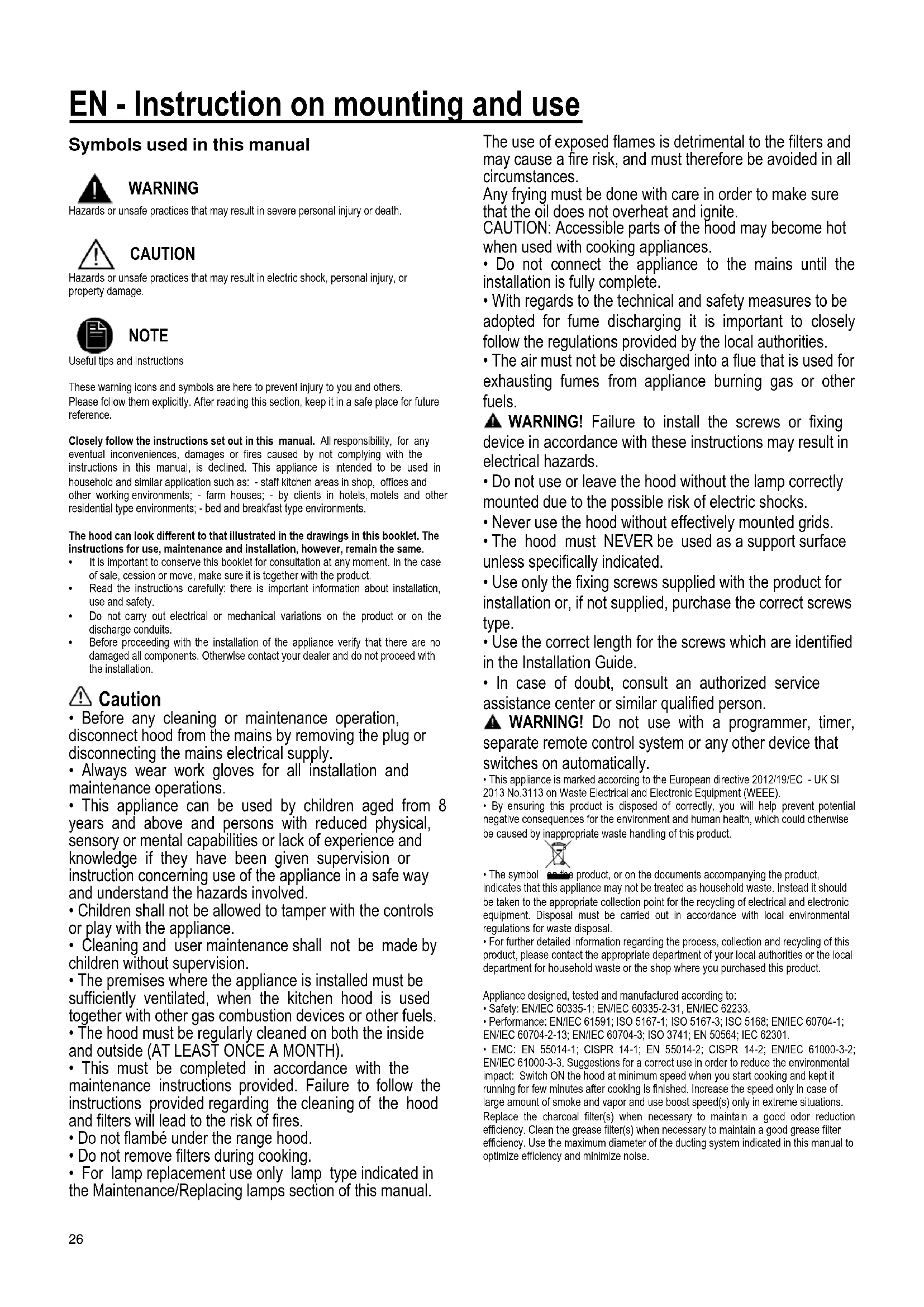 - This must be completed in accordance with the maintenance instructions provided. Failure to follow the instructions provided regarding the cleaning of the hood and filters will lead to the risk of fires.