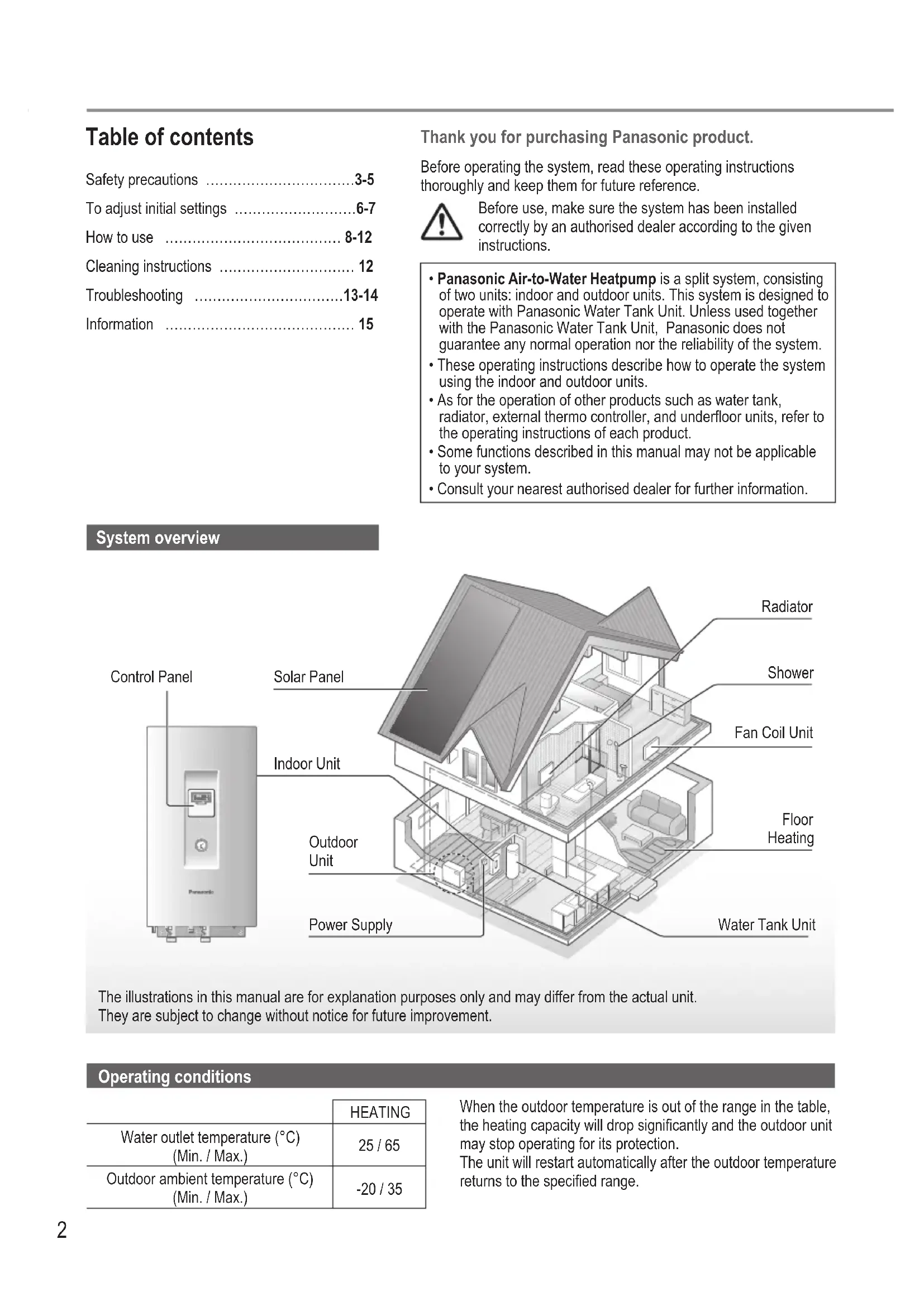 - Panasonic Air-to-Water Heatpump is a split system, consisting of two units: indoor and outdoor units. This system is designed to operate with Panasonic Water Tank Unit. Unless used together with the Panasonic Water Tank Unit, Panasonic does not guarantee any normal operation nor the reliability of the system.