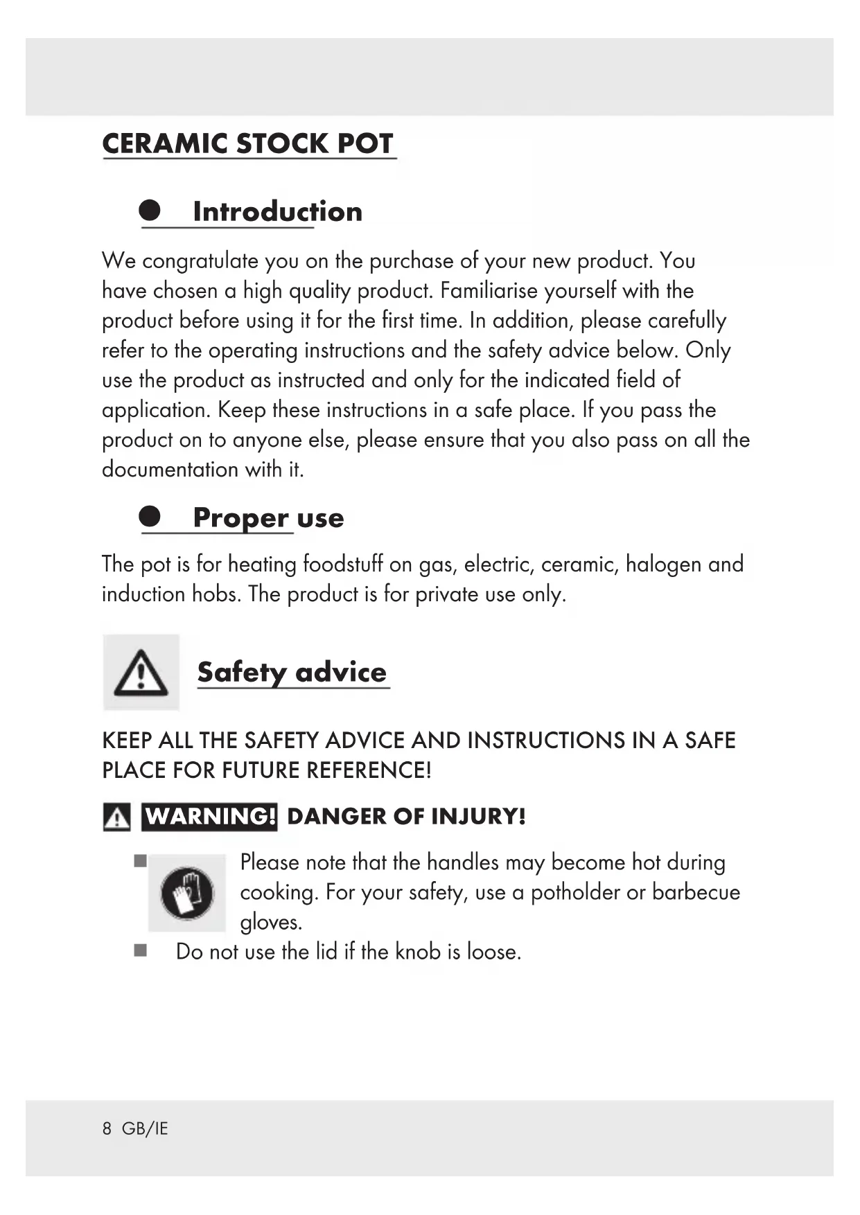 Please note that the handles may become hot during cooking. For your safety, use a potholder or barbecue gloves. Do not use the lid if the knob is loose. 8 GB/IE9 GB/IE WARNING! DANGER OF DAMAGE TO PROPERTY! Pots and pans in which fat is being heated up must never be left unattended. Fat can very quickly overheat and ignite. Never try to extinguish a fat fire with water. Cover the flames with a pot / pan lid or a thick cloth. Use heat resistant plastic or wooden kitchen utensils in order not to damage the non-stick coating. Do not cut food directly in the pot. Do not place meat which is still dripping with liquid into hot fat. The fat splattering out on to a hot hob could easily cause a fire. High temperatures may discolour the exterior of the product. This does not indicate faulty material, nor does it impair the product’s quality or function. To avoid heat loss, choose a hotplate with a diameter of the pot that matches. The item is suitable for keeping dishes warm inside the oven (max. 150 °C for 1 hour). Never hold the hot product under cold running water. The bottom of the product may be damaged or fall off. This product is suitable for dishwasher. Frequently cleaning the product with harsh cleaners may damage it and might cause discolouration. Aluminium pieces may discolour when placed in the dishwasher. ATTENTION! The glass lid is fragile / not impact-resistant!10 GB/IE For washing the pot by hand, use hot water with a little ordinary washing-up liquid. Avoid using sharp or pointed objects for this in order not to damage the coating. ATTENTION: RISK OF SCRATCHES! Do not move the pan back and forth on glass-ceramic hobs! We recommend before cooking to wipe briefly the surface of the hob and the cookware bottom with a clean, lint-free cloth (e.g. microfiber) to reduce the risk of scratches. Please note that using this product might cause slight discolourations due to the product’s light colour. Such discolourations are signs of wear and do not affect the quality of the coating and its fitness for use. Note for induction hobs Note: A noise may occur under certain conditions, resulting from the electromagnetic properties of the heat source and the pot / pan. This is totally normal and does not imply that your induction hob or your cookware is damaged. Place the pot / pan in the middle of the induction hotplate. CAUTION! High heating-up rate! Do not overheat cookware when preheating.11 GB/IE The room must be aired out well, in the event cookware overheats. This article combines the benefits of aluminium cookware, such as low weight and high thermal conductivity, with the benefits of cooking with induction. To enable this, magnetic steel elements have been inserted in the aluminium base. Consequently the base is not magnetic throughout, so that on induction hobs that are significantly greater than the base diameter, it can happen that the induction coils do not react. This is not a quality defect and does not represent any impairment of the functionality. So that the article functions perfectly, please always place it on the hob corresponding with the base diameter. Usage Before first use, remove any stickers or labels from the article and rinse it in hot water. Before using the pot for the first time, boil it out with water 2 to 3 times to completely remove all manufacturing residue. Do not overheat the pot while empty or filled to prevent the non- stick effect from weakening due to damage to the coating.12 GB/IE Disposal The packaging is made entirely of recyclable materials, which you may dispose of at local recycling facilities. Contact your local refuse disposal authority for more details of how to dispose of your worn-out product. Warranty The product has been manufactured to strict quality guidelines and meticulously examined before delivery. In the event of product defects you have legal rights against the retailer of this product. Your legal rights are not limited in any way by our warranty detailed below. The warranty for this product is 3 years from the date of purchase. Should this product show any fault in materials or manufacture within 3 years from the date of purchase, we will repair or replace it – at our choice – free of charge to you. The warranty period begins on the date of purchase. Please keep the original sales receipt in a safe location. This document is required as your proof of purchase. This warranty becomes void if the product has been damaged, or used or maintained improperly. The warranty applies to defects in material or manufacture. This warranty does not cover product parts subject to normal wear, thus possibly considered consumables (e.g. batteries) or for damage to fragile parts, e.g. switches, rechargeable batteries or glass parts.CASSEROLE EN CÉRAMIQUE Introduction Nous vous félicitons pour l’achat de votre nouveau produit. Vous avez opté pour un produit de grande qualité. Avant la première mise en service, vous devez vous familiariser avec toutes les fonctions du produit. Veuillez lire attentivement le mode d’emploi ci-dessous et les consignes de sécurité. N’utilisez le produit que pour l’usage décrit et les domaines d’application cités. Conservez ces instructions. Si vous donnez le produit à des tiers, remettez-leur également la totalité des documents. Utilisation conforme à l’usage prévu La casserole est conçue pour réchauffer des aliments sur des champs de cuisson à gaz, électriques, vitro-céramiques, halogènes ou à induction. Ce produit est destiné uniquement à un usage privé. Consignes de sécurité CONSERVER TOUTES LES CONSIGNES DE SÉCURITÉ ET INSTRUCTIONS POUR CONSULTATION ULTÉRIEURE ! RISQUE DE BLESSURES !