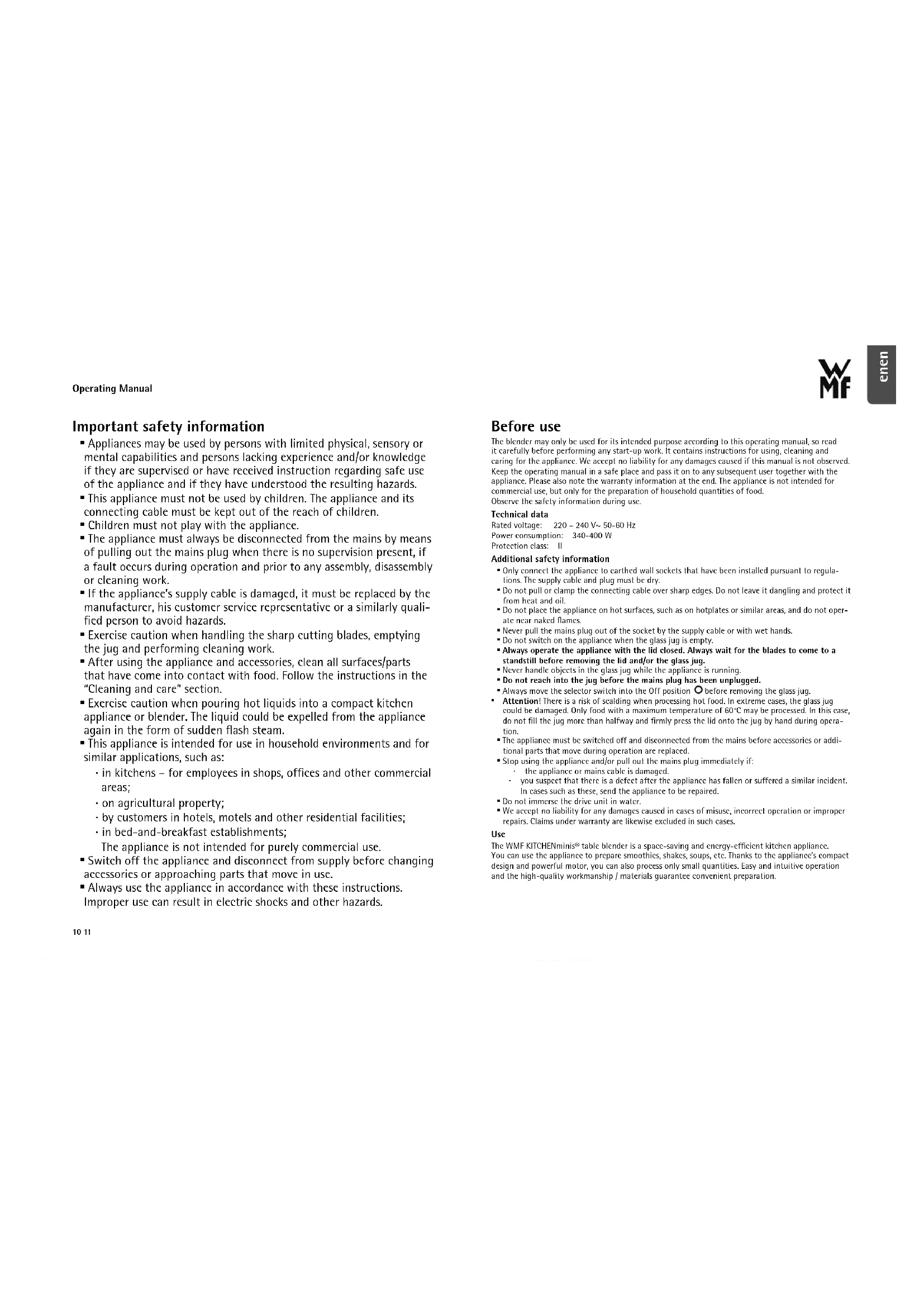 - Always use the appliance in accordance with these instructions. Improper use can result in electric shocks and other hazards. Before use The blender may only be used for its intended purpose according to this operating manual, so read it carefully before performing any start-up work. It contains instructions for using, cleaning and caring for the appliance. We accept no liability for any damages caused if this manual is not observed. Keep the operating manual in a safe place and pass it on to any subsequent user together with the appliance. Please also note the warranty information at the end. The appliance is not intended for commercial use, but only for the preparation of household quantities of food. Observe the safety information during use. Technical data Rated voltage: 220 – 240 V~ 50-60 Hz Power consumption: 340-400 W Protection class: II Additional safety information