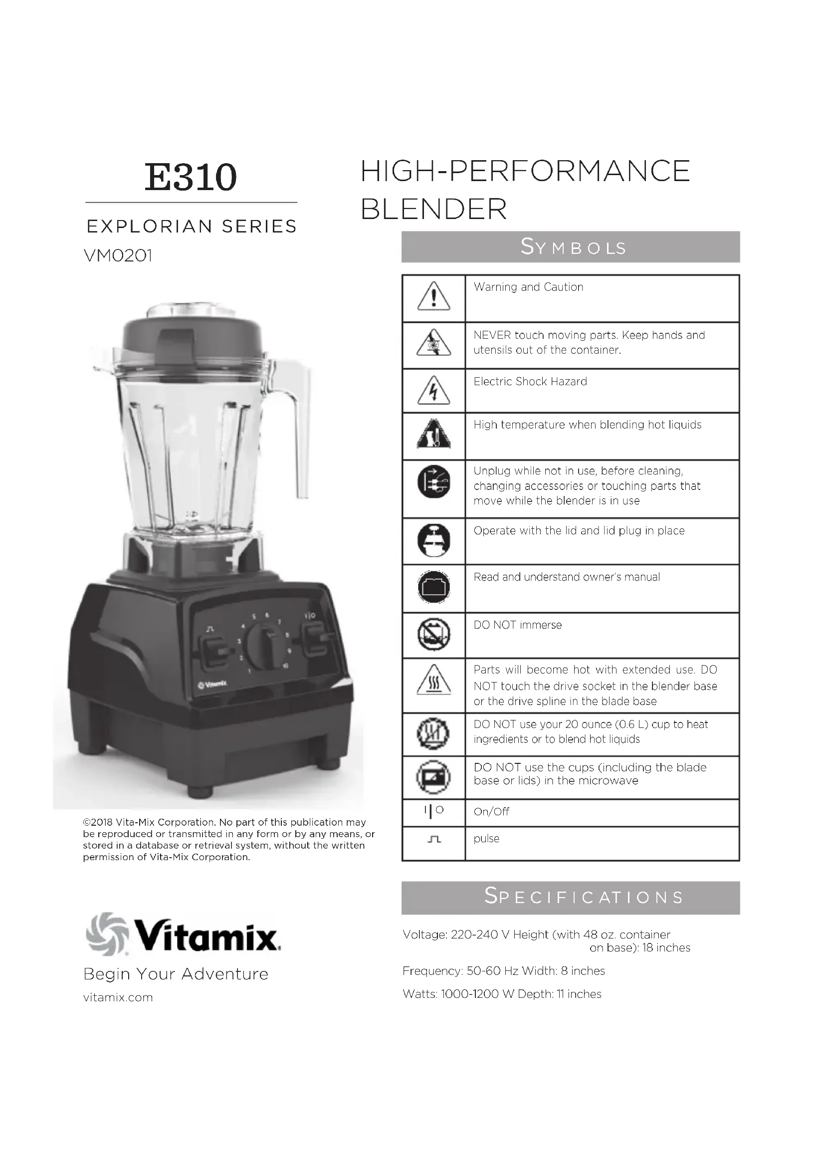 Begin Your Adventurevitamix.com VM0201 Sy m b o lS Warning and CautionNEVER touch moving parts. Keep hands and utensils out of the container.Electric Shock HazardHigh temperature when blending hot liquidsUnplug while not in use, before cleaning, changing accessories or touching parts that move while the blender is in useOperate with the lid and lid plug in placeRead and understand owner’s manualDO NOT immerseParts will become hot with extended use. DO NOT touch the drive socket in the blender base or the drive spline in the blade baseDO NOT use your 20 ounce (0.6 L) cup to heat ingredients or to blend hot liquidsDO NOT use the cups (including the blade base or lids) in the microwaveI OOn/Opulse HIGH-PERFORMANCE BLENDER Sp e c i f i c at i o n S E310 EXPLORIAN SERIES Voltage: 220-240 V Height (with 48 oz. container on base): 18 inchesFrequency: 50-60 Hz Width: 8 inchesWatts: 1000-1200 W Depth: 11 inches ©2018 Vita-Mix Corporation. No part of this publication may be reproduced or transmitted in any form or by any means, or stored in a database or retrieval system, without the written permission of Vita-Mix Corporation.2 im p o rta n t in StructionS fo r Sa f e uS e