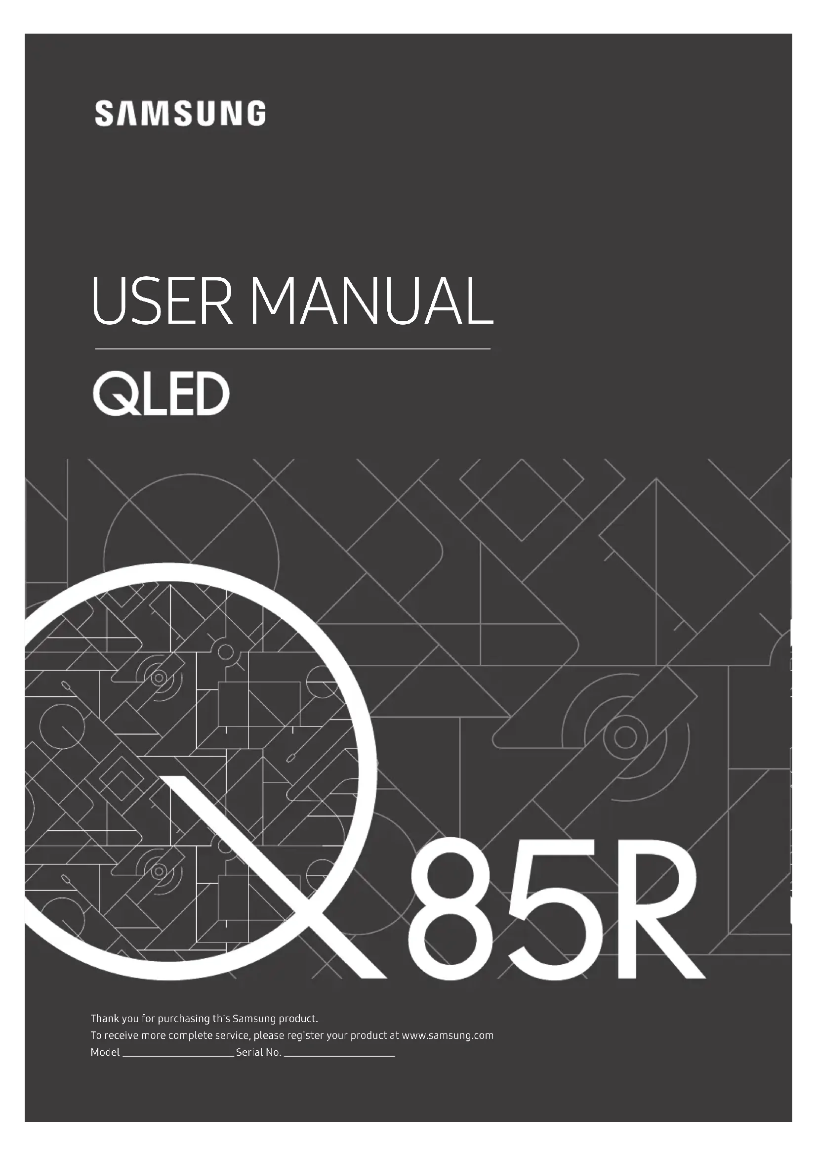 Thank you for purchasing this Samsung product. To receive more complete service, please register your product at www.samsung.com Model Serial No. USER MANUALBefore Reading This User Manual This TV comes with this user manual and an embedded e-Manual. Before reading this user manual, review the following: User Manual Read this provided user manual to see information about product safety, installation, accessories, initial configuration, and product specifications. e-Manual For more information about this TV, read the e-Manual embedded in the product.