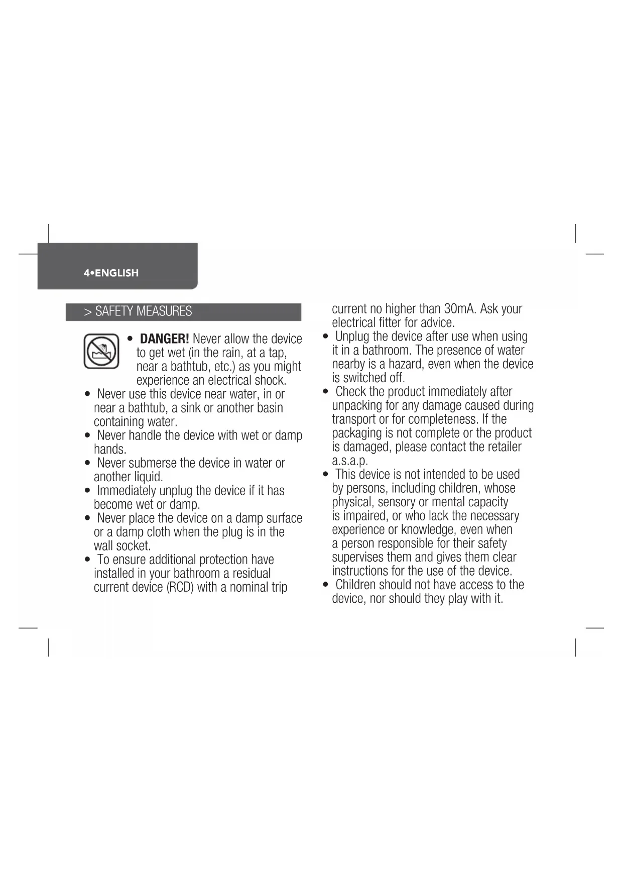 - Never use this device near water, in or near a bathtub, a sink or another basin containing water.