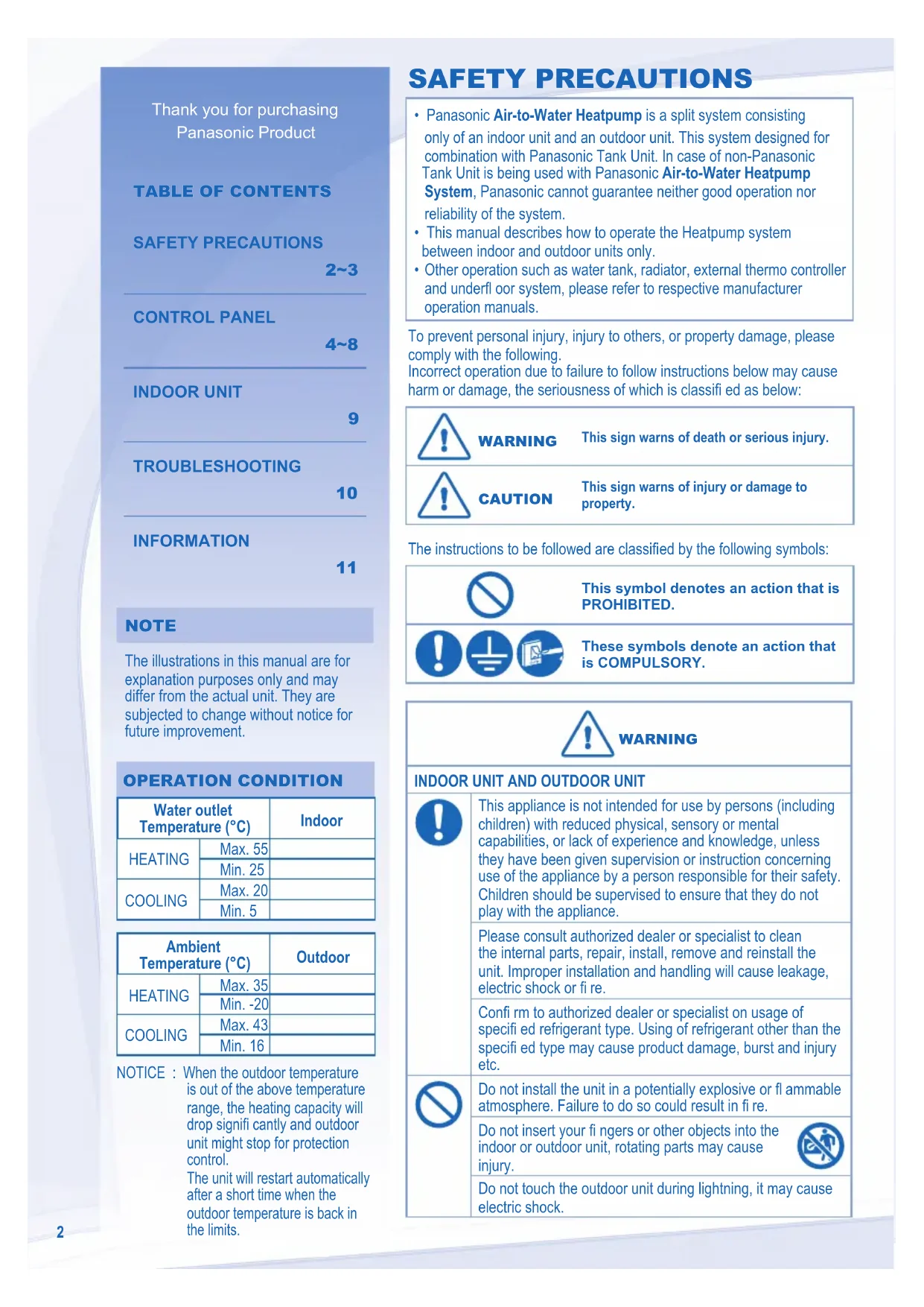 NOTE NOTE The illustrations in this manual are for explanation purposes only and may differ from the actual unit. They are subjected to change without notice for future improvement. OPERATION CONDITION OPERATION CONDITION Water outlet Temperature (°C) Indoor HEATING Max. 55 Min. 25 COOLING Max. 20 Min. 5 Ambient Temperature (°C) Outdoor HEATING Max. 35 Min. -20 COOLING Max. 43 Min. 16 NOTICE : When the outdoor temperature is out of the above temperature range, the heating capacity will drop signifi cantly and outdoor unit might stop for protection control. The unit will restart automatically after a short time when the outdoor temperature is back in the limits. To prevent personal injury, injury to others, or property damage, please comply with the following. Incorrect operation due to failure to follow instructions below may cause harm or damage, the seriousness of which is classifi ed as below: WARNING WARNING This sign warns of death or serious injury. CAUTION CAUTION This sign warns of injury or damage to property. The instructions to be followed are classifi ed by the following symbols: This symbol denotes an action that is PROHIBITED. These symbols denote an action that is COMPULSORY. WARNING WARNING