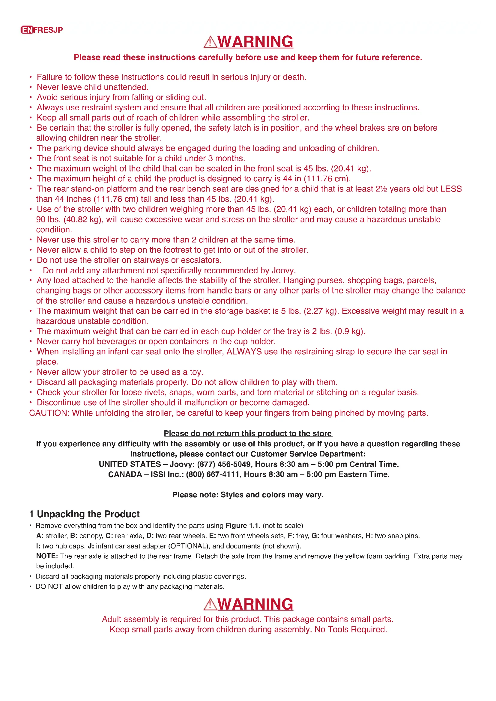 - Discontinue use of the stroller should it malfunction or become damaged. CAUTION:Whileunfoldingthestroller,becarefultokeepyourngersfrombeingpinchedbymovingparts. Please do not return this product to the store If you experience any difculty with the assembly or use of this product, or if you have a question regarding these instructions, please contact our Customer Service Department: UNITED STATES – Joovy: (877) 456-5049, Hours 8:30 am – 5:00 pm Central Time. CANADA – ISSI Inc.: (800) 667-4111, Hours 8:30 am – 5:00 pm Eastern Time. Please note: Styles and colors may vary. 1 Unpacking the Product