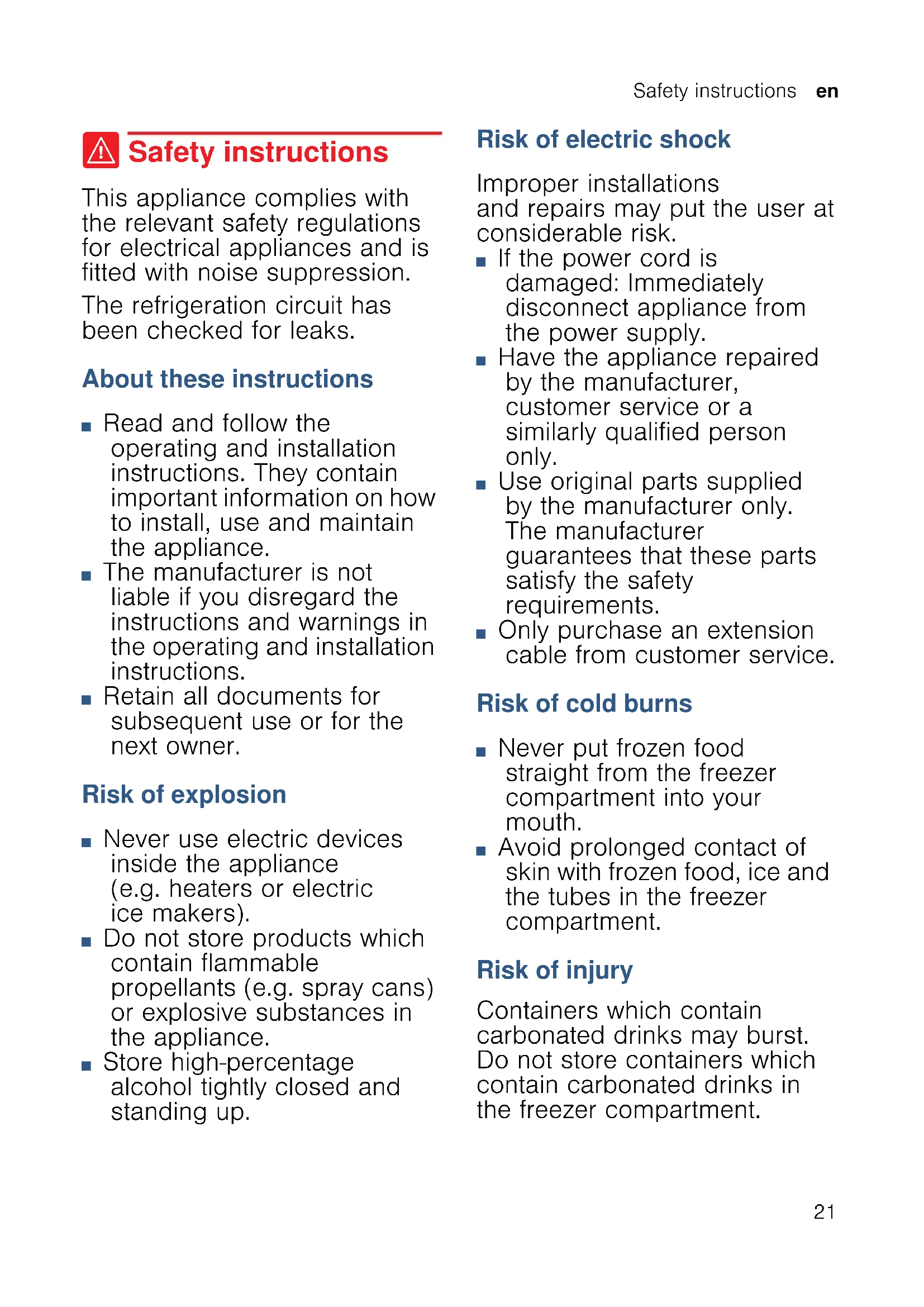 ( Safety instructions Safety instructions This appliance complies with the relevant safety regulations for electrical appliances and is fitted with noise suppression. The refrigeration circuit has been checked for leaks. About these instructions ■ Read and follow the operating and installation instructions. They contain important information on how to install, use and maintain the appliance. ■ The manufacturer is not liable if you disregard the instructions and warnings in the operating and installation instructions. ■ Retain all documents for subsequent use or for the next owner. Risk of explosion ■ Never use electric devices inside the appliance (e.g. heaters or electric ice makers). ■ Do not store products which contain flammable propellants (e.g. spray cans) or explosive substances in the appliance. ■ Store high-percentage alcohol tightly closed and standing up. Risk of electric shock Improper installations and repairs may put the user at considerable risk. ■ If the power cord is damaged: Immediately disconnect appliance from the power supply. ■ Have the appliance repaired by the manufacturer, customer service or a similarly qualified person only. ■ Use original parts supplied by the manufacturer only. The manufacturer guarantees that these parts satisfy the safety requirements. ■ Only purchase an extension cable from customer service. Risk of cold burns ■ Never put frozen food straight from the freezer compartment into your mouth. ■ Avoid prolonged contact of skin with frozen food, ice and the tubes in the freezer compartment. Risk of injury Containers which contain carbonated drinks may burst. Do not store containers which contain carbonated drinks in the freezer compartment.en Safety instructions