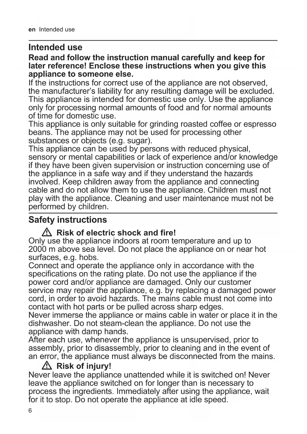 - Guarantee Overview Please fold out the illustrated pages. 1 Transparent lid with safety switch 2 Housing 3 Container 4 Fly cutter The grinding level The grinding level of the coffee is deter- mined by the quantity that has been filled and the grinding duration. A shorter grinding duration results in more coarsely ground coffee. Also observe the grinding level specifi- cations in the instruction manual for your coffee machine. Coffee Quantity Grinding duration 10 g max. 20 sec. 40 g max. 25 sec. 75 g max. 30 sec. Espresso Regardless of the type of beans and the degree of roasting, espresso coffee requires a “fine” level of grinding. Quantity Grinding duration 16 g (for 2 cups) max. 20 sec. 32 g (for 4 cups) max. 25 sec. 64 g (for 8 cups) max. 30 sec. Operating the appliance Caution! Only fill the appliance with roasted coffee or espresso beans. Never process more than 75 g of beans ■ Fill up with the desired quantity of beans. Note: The measurement spoon belonging to the espresso/coffee maker can be used for filling the coffee beans. One measuring spoonful equals roughly 8 g. ■ Put on lid with switch. ■ Plug into the mains. ■ Press switch down. The beans will be ground. ■ After the desired grinding duration, release the switch and wait for the blade to stop. ■ Disconnect the mains plug. ■ Remove the lid and remove or decant the ground coffee.8 en Cleaning and maintenance Cleaning and maintenance The appliance requires no maintenance. Thorough cleaning protects the appliance from damage and keeps it functional. W Risk of electric shock! Never immerse the base unit in liquids and do not clean in the dishwasher. Do not steam-clean the appliance. Before cleaning the appliance, pull out the mains plug! Caution! Do not use abrasive cleaning agents. Surfaces may be damaged. ■ Disconnect the mains plug. ■ Clean the container and lid with a brush or dry cloth. The lid may also be washed in cold or tepid water. ■ Wipe the housing with a damp cloth. Disposal p. 8