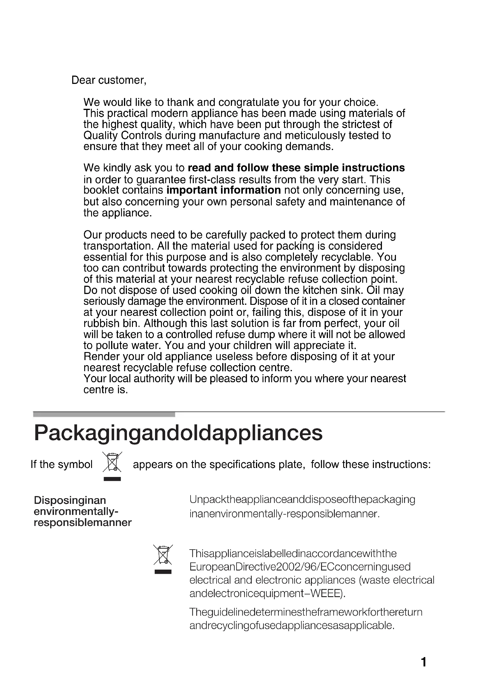 Avvertenze per l’uso Kullanma KIlavuzu Manual de utilizaçao Cod. 9000133363 FDear customer, We would like to thank and congratulate you for your choice. This practical modern appliance has been made using materials of the highest quality, which have been put through the strictest of Quality Controls during manufacture and meticulously tested to ensure that they meet all of your cooking demands. We kindly ask you to read and follow these simple instructions in order to guarantee first-class results from the very start. This booklet contains important information not only concerning use, but also concerning your own personal safety and maintenance of the appliance. Our products need to be carefully packed to protect them during transportation. All the material used for packing is considered essential for this purpose and is also completely recyclable. You too can contribut towards protecting the environment by disposing of this material at your nearest recyclable refuse collection point. Do not dispose of used cooking oil down the kitchen sink. Oil may seriously damage the environment. Dispose of it in a closed container at your nearest collection point or, failing this, dispose of it in your rubbish bin. Although this last solution is far from perfect, your oil will be taken to a controlled refuse dump where it will not be allowed to pollute water. You and your children will appreciate it. Render your old appliance useless before disposing of it at your nearest recyclable refuse collection centre. Your local authority will be pleased to inform you where your nearest centre is.