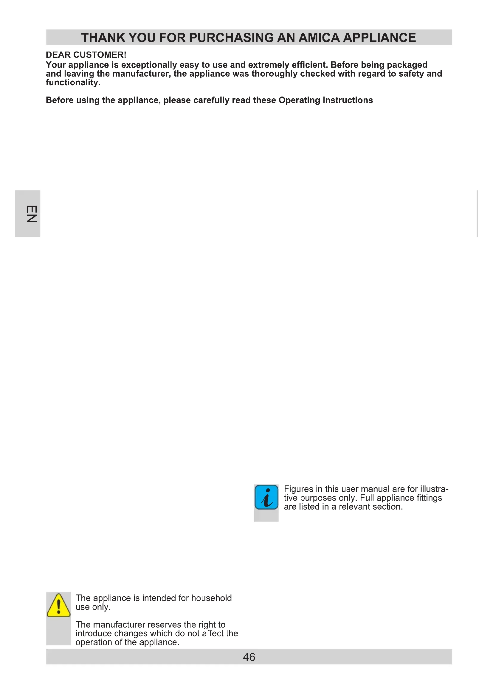 DE46 Yourapplianceisexceptionallyeasytouseandextremelyefcient.Beforebeingpackaged andleavingthemanufacturer,theappliancewasthoroughlycheckedwithregardtosafetyand functionality. Beforeusingtheappliance,pleasecarefullyreadtheseOperatingInstructions DEARCUSTOMER! THANK YOU FOR PURCHASING AN AMICA APPLIANCE The appliance is intended for household use only. The manufacturer reserves the right to introduce changes which do not affect the operation of the appliance.