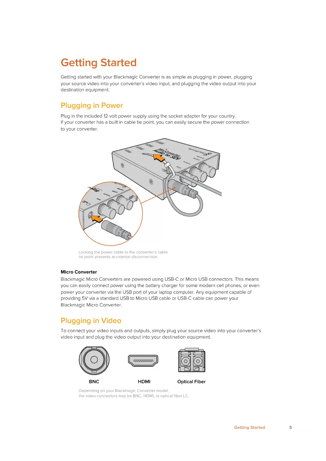 SDI IN POWER +12V SDI to Analog Locking the power cable to the converter’s cable tie point prevents accidental disconnection. Micro Converter Blackmagic Micro Converters are powered using USB-C or Micro USB connectors. This means you can easily connect power using the battery charger for some modern cell phones, or even power your converter via the USB port of your laptop computer. Any equipment capable of providing 5V via a standard USB to Micro USBcable or USB-C cable can power your Blackmagic Micro Converter. Plugging in Video To connect your video inputs and outputs, simply plug your source video into your converter’s video input and plug the video output into your destination equipment. BNC HDMI Optical Fiber Depending on your Blackmagic Convertermodel, the videoconnectors may be BNC, HDMI, or optical fiber LC. Getting Started 5Optical Fiber Connectors Some Blackmagic Converter models include an SFP socket to accept a compatible SFP optical fiber module that supports up to 3G, 6G or 12G-SDI video. The module is an optical transmitter and receiver with sockets for optical fiber cables.