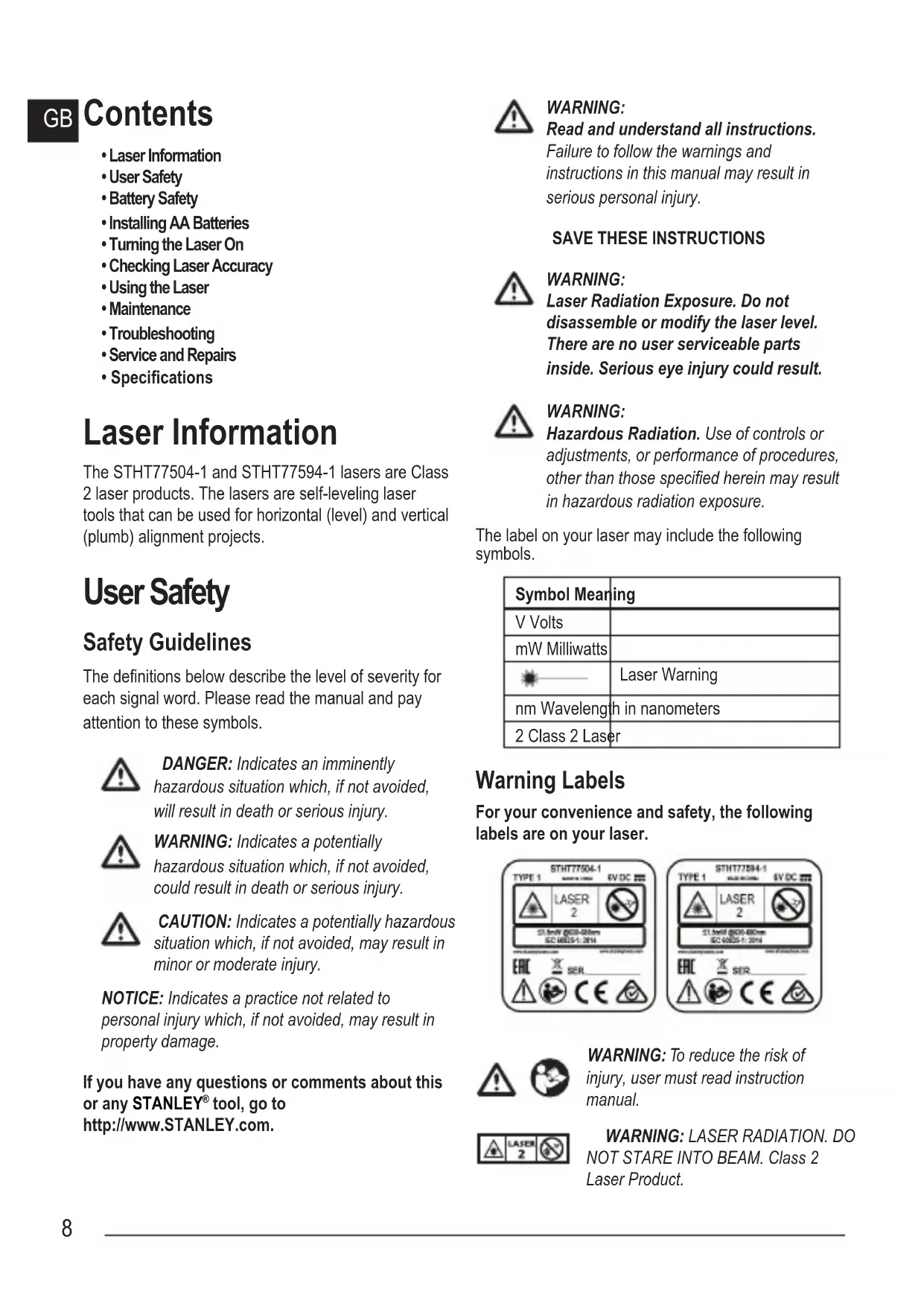 - Specications Laser Information The STHT77504-1 and STHT77594-1 lasers are Class 2 laser products. The lasers are self-leveling laser tools that can be used for horizontal (level) and vertical (plumb) alignment projects. User Safety Safety Guidelines The denitions below describe the level of severity for each signal word. Please read the manual and pay attention to these symbols.