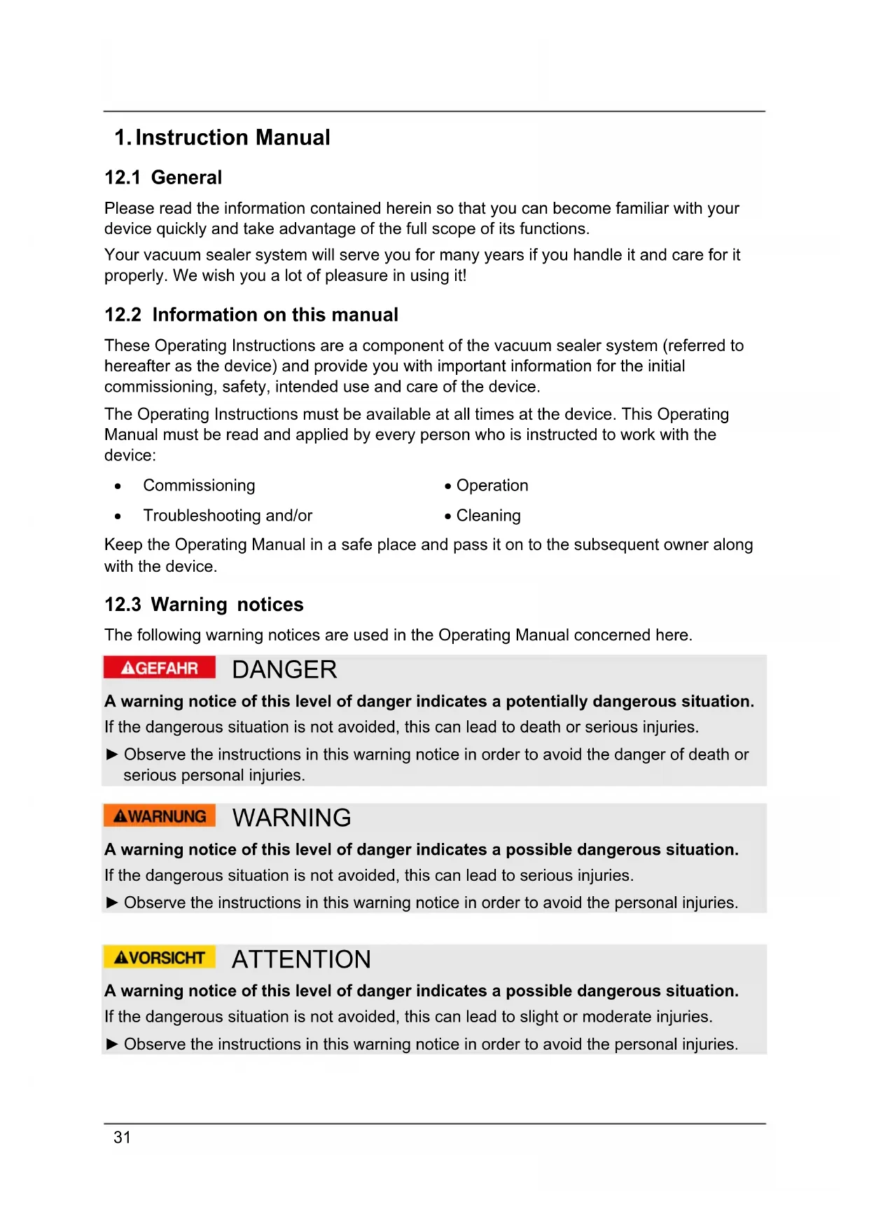 These Operating Instructions are a component of the vacuum sealer system (referred to hereafter as the device) and provide you with important information for the initial commissioning, safety, intended use and care of the device. The Operating Instructions must be available at all times at the device. This Operating Manual must be read and applied by every person who is instructed to work with the device: Commissioning Operation Troubleshooting and/or Cleaning Keep the Operating Manual in a safe place and pass it on to the subsequent owner along with the device.