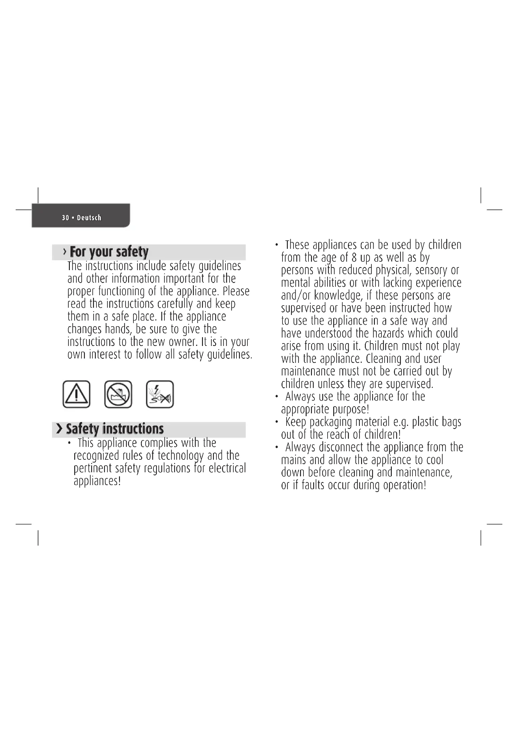 • These appliances can be used by children from the age of 8 up as well as by persons with reduced physical, sensory or mental abilities or with lacking experience and/or knowledge, if these persons are supervised or have been instructed how to use the appliance in a safe way and have understood the hazards which could arise from using it. Children must not play with the appliance. Cleaning and user maintenance must not be carried out by children unless they are supervised.