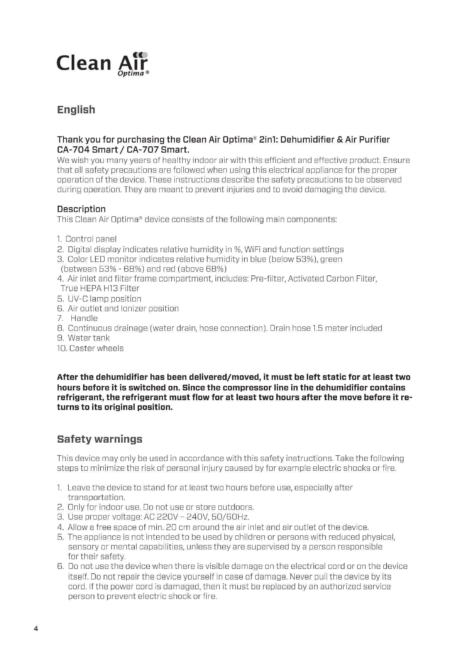 Thank you for purchasing the Clean Air Optima® 2in1: Dehumidifier & Air Purifier CA-704 Smart / CA-707 Smart.