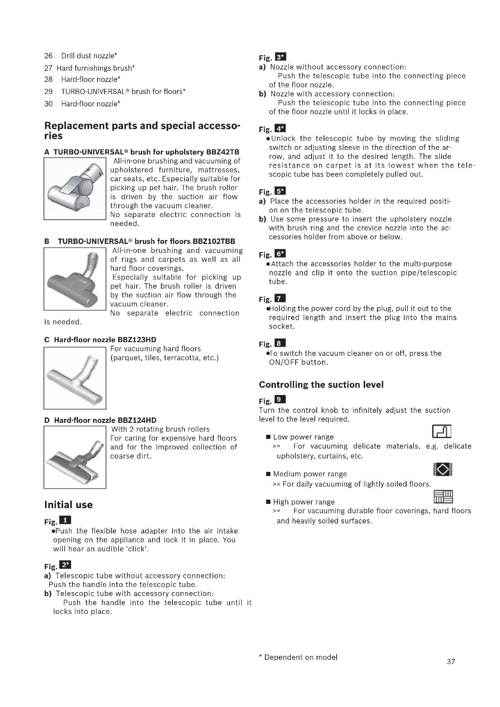 - Dependent on model37 26 Drill dust nozzle* 27 Hard furnishings brush* 28 Hard-floor nozzle* 29 TURBO-UNIVERSAL® brush for floors* 30 Hard-floor nozzle* Replacement parts and special accesso- ries A TURBO-UNIVERSAL® brush for upholstery BBZ42TB All-in-one brushing and vacuuming of upholstered furniture, mattresses, car seats, etc. Especially suitable for picking up pet hair. The brush roller is driven by the suction air flow through the vacuum cleaner. No separate electric connection is needed. B TURBO-UNIVERSAL® brush for floors BBZ102TBB All-in-one brushing and vacuuming of rugs and carpets as well as all hard floor coverings. Especially suitable for picking up pet hair. The brush roller is driven by the suction air flow through the vacuum cleaner. No separate electric connection is needed. C Hard-floor nozzle BBZ123HD For vacuuming hard floors (parquet, tiles, terracotta, etc.) D Hard-floor nozzle BBZ124HD