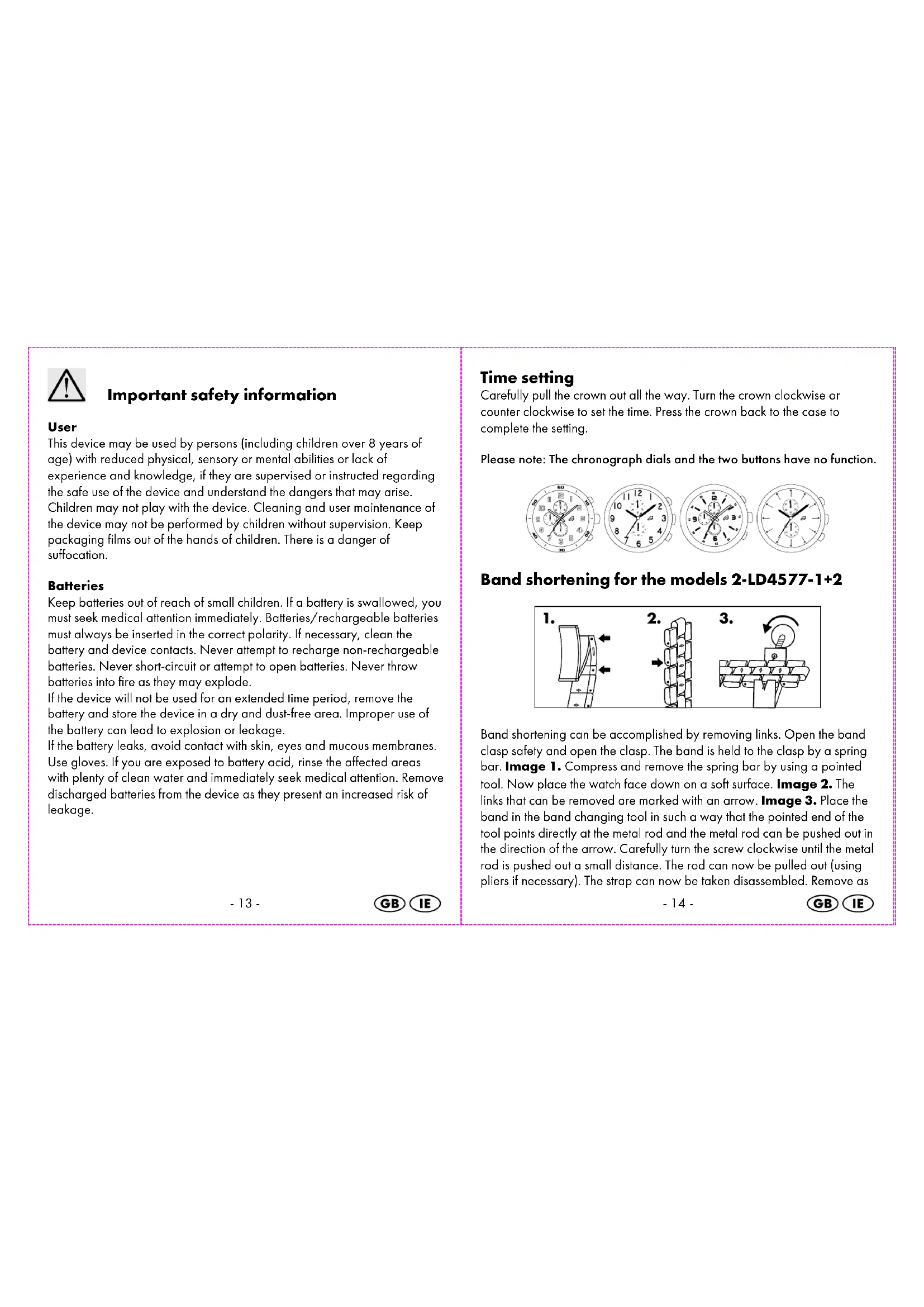 Disposal of the watch This wristwatch may not be disposed of with normal household waste. Dispose of the wristwatch at an approved disposal facility or at your local recycling centre. Please observe the current rules and regulations when disposing of the watch. Contact the disposal system if in doubt. Disposal of the batteries Please dispose of your batteries properly in containers especially set up at retailers. Batteries do not belong in household waste. Dispose of the batteries at an approved disposal facility or at your local recycling centre. Contact the disposal system if in doubt.-