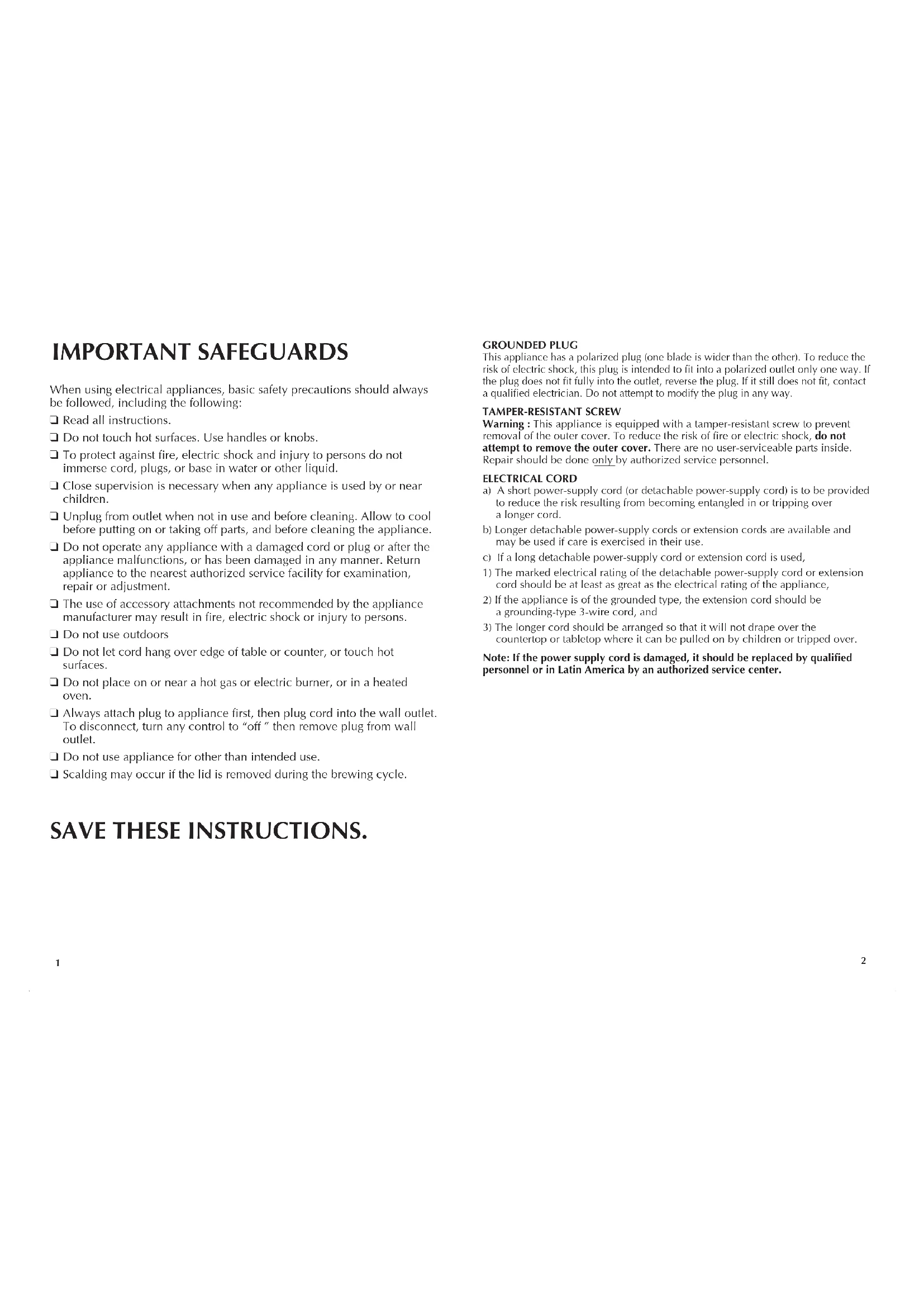 To protect against fire, electric shock and injury to persons do not immerse cord, plugs, or base in water or other liquid.