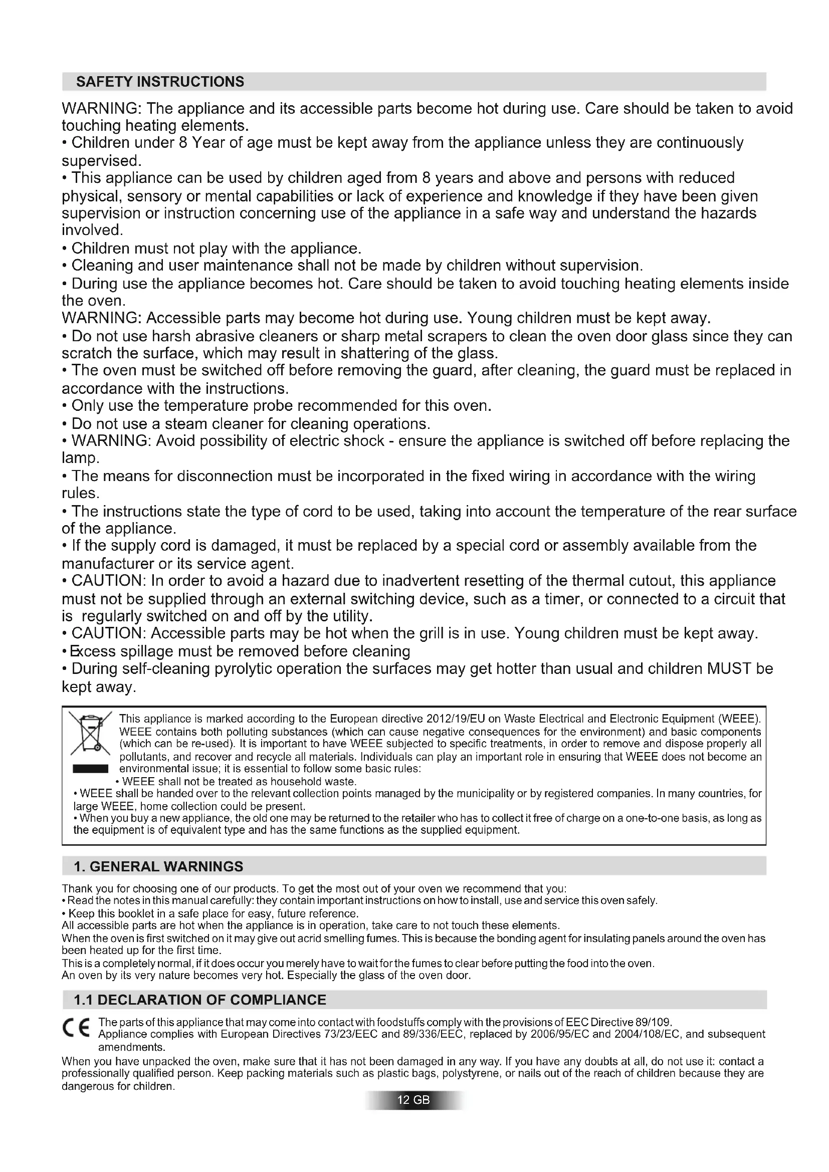 - Keep this booklet in a safe place for easy, future reference. All accessible parts are hot when the appliance is in operation, take care to not touch these elements. When the oven is first switched on it may give out acrid smelling fumes. This is because the bonding agent for insulating panels around the oven has been heated up for the first time. This is a completely normal, if it does occur you merely have to wait for the fumes to clear before putting the food into the oven. An oven by its very nature becomes very hot. Especially the glass of the oven door. The parts of this appliance that may come into contact with foodstuffs comply with the provisions of EEC Directive 89/109. Appliance complies with European Directives 73/23/EEC and 89/336/EEC, replaced by 2006/95/EC and 2004/108/EC, and subsequent amendments.