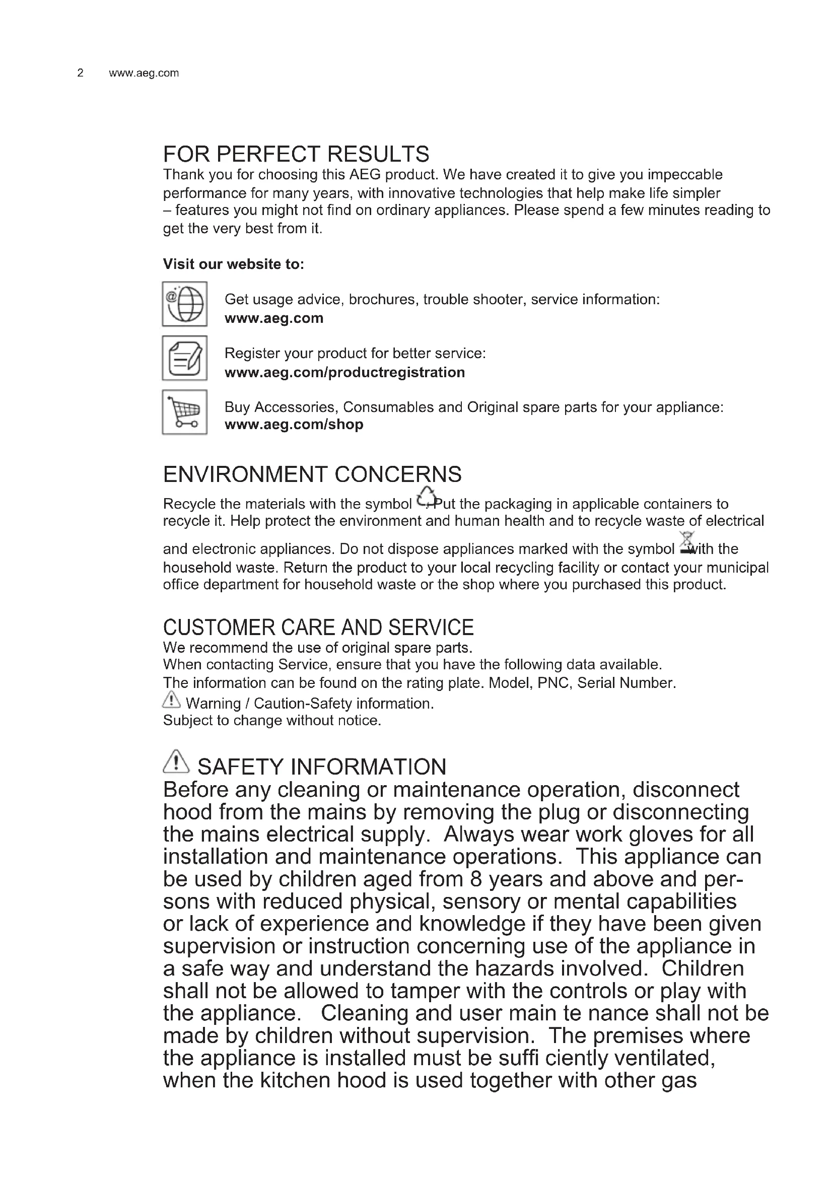 We recommend the use of original spare parts. When contacting Service, ensure that you have the following data available. The information can be found on the rating plate. Model, PNC, Serial Number. Warning / Caution-Safety information. Subject to change without notice. SAFETY INFORMATION Before any cleaning or maintenance operation, disconnect hood from the mains by removing the plug or disconnecting the mains electrical supply. Always wear work gloves for all installation and maintenance operations. This appliance can be used by children aged from 8 years and above and per- sons with reduced physical, sensory or mental capabilities or lack of experience and knowledge if they have been given supervision or instruction concerning use of the appliance in a safe way and understand the hazards involved. Children shall not be allowed to tamper with the controls or play with the appliance. Cleaning and user main te nance shall not be made by children without supervision. The premises where the appliance is installed must be suffi ciently ventilated, when the kitchen hood is used together with other gas