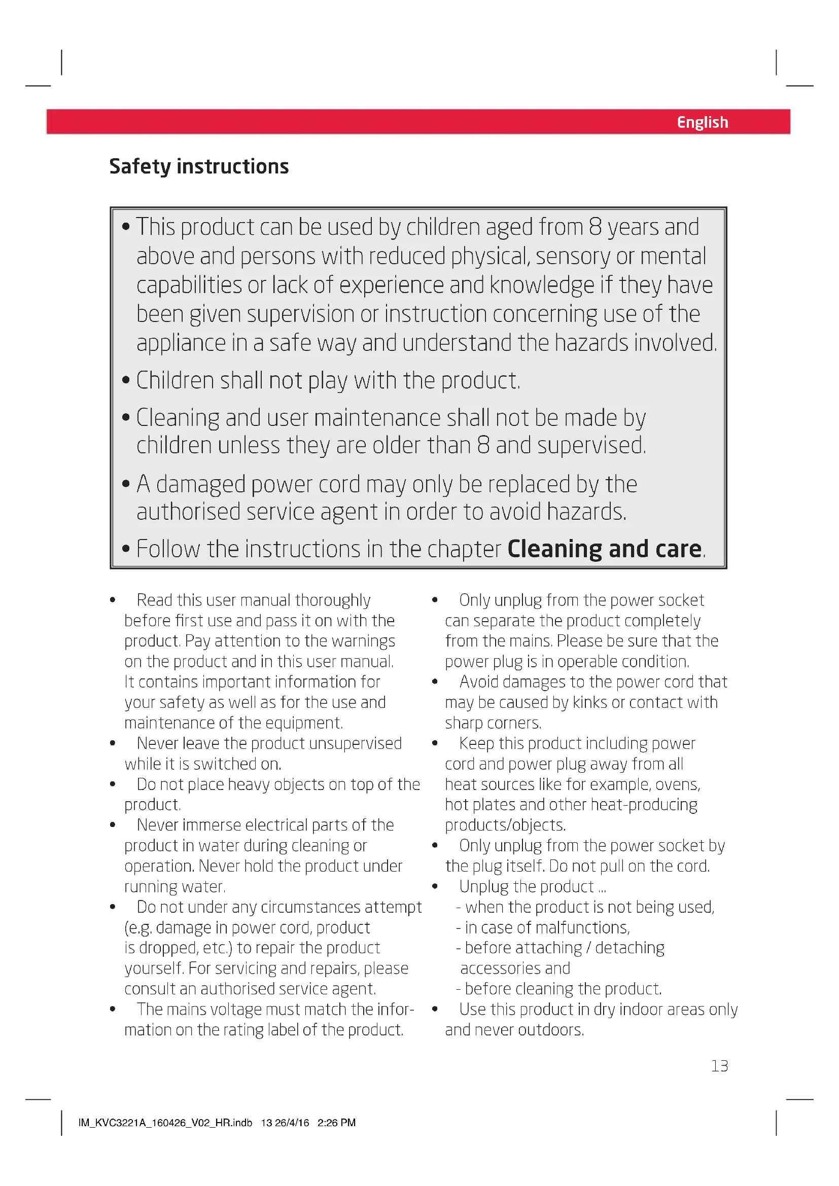 - Use this product in dry indoor areas only and never outdoors. IM_KVC3221A_160426_V02_HR.indb 13 26/4/16 2:26 PMEnglish