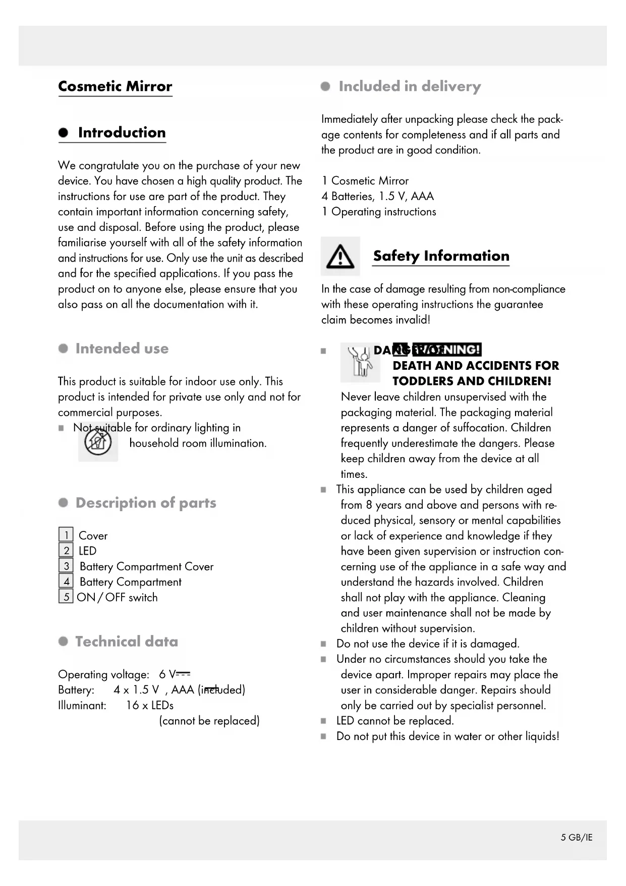 TODDLERS AND CHILDREN! Never leave children unsupervised with the packaging material. The packaging material represents a danger of suffocation. Children frequently underestimate the dangers. Please keep children away from the device at all times. This appliance can be used by children aged from 8 years and above and persons with re- duced physical, sensory or mental capabilities or lack of experience and knowledge if they have been given supervision or instruction con- cerning use of the appliance in a safe way and understand the hazards involved. Children shall not play with the appliance. Cleaning and user maintenance shall not be made by children without supervision. Do not use the device if it is damaged. Under no circumstances should you take the device apart. Improper repairs may place the user in considerable danger. Repairs should only be carried out by specialist personnel. LED cannot be replaced. Do not put this device in water or other liquids!6 GB/IE Battery safety information DANGER TO LIFE! Batteries are not intended for children. If acci- dentally swallowed seek immediate medical attention. CAUTION! EXPLOSION HAZARD! Never recharge nonrechargeable batteries and do not short-circuit and / or open any batteries. Never throw batteries into fire or water. Do not exert mechanical loads to batteries. Risk of battery leaking In the event of a battery leak, immediately remove it from the device to prevent damage. Avoid contact with the skin, eyes and mucous membranes. In the event of contact with battery acid, thoroughly flush the affected area with clean water and seek immediate medical attention. Avoid extreme conditions and temperatures which may impact batteries, e.g. radiators / direct sunlight! Remove the battery from the device if it is not going to be used for extended periods. Risk of property damage Use only the recommended battery type! When inserting the battery ensure the correct polarity! This is indicated on the battery com- partment. If necessary, clean the battery and device contacts before inserting the battery. Promptly remove drained batteries from the product. Avoid fire hazards and injury hazards CAUTION! RISK OF INJURY! Broken safety glass must be replaced before the lamp is used again. This lamp is suitable only for use indoors. CAUTION! FIRE HAZARD! Never expose the product to direct sunlight or other sources of light. Do not leave the product unattended. Otherwise there is a risk of fire through concentrated light rays and concentrated heat. Do not subject the device to any extreme tem- peratures or severe mechanical stress. Otherwise this may result in deformation of the product. Inserting / replacing the batteries Rotate the mirror side with 5x magnification counter clockwise and remove the cover