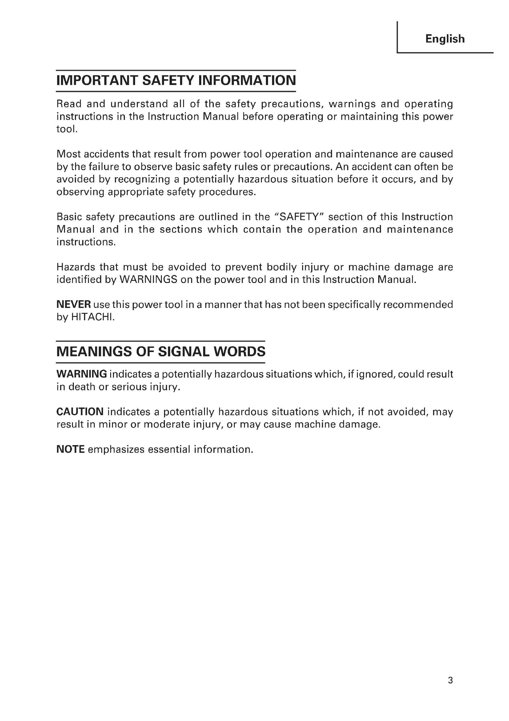Read and understand all of the safety precautions, warnings and operating instructions in the Instruction Manual before operating or maintaining this power tool. Most accidents that result from power tool operation and maintenance are caused by the failure to observe basic safety rules or precautions. An accident can often be avoided by recognizing a potentially hazardous situation before it occurs, and by observing appropriate safety procedures. Basic safety precautions are outlined in the “SAFETY” section of this Instruction Manual and in the sections which contain the operation and maintenance instructions. Hazards that must be avoided to prevent bodily injury or machine damage are identified by WARNINGS on the power tool and in this Instruction Manual. NEVER use this power tool in a manner that has not been specifically recommended by HITACHI.