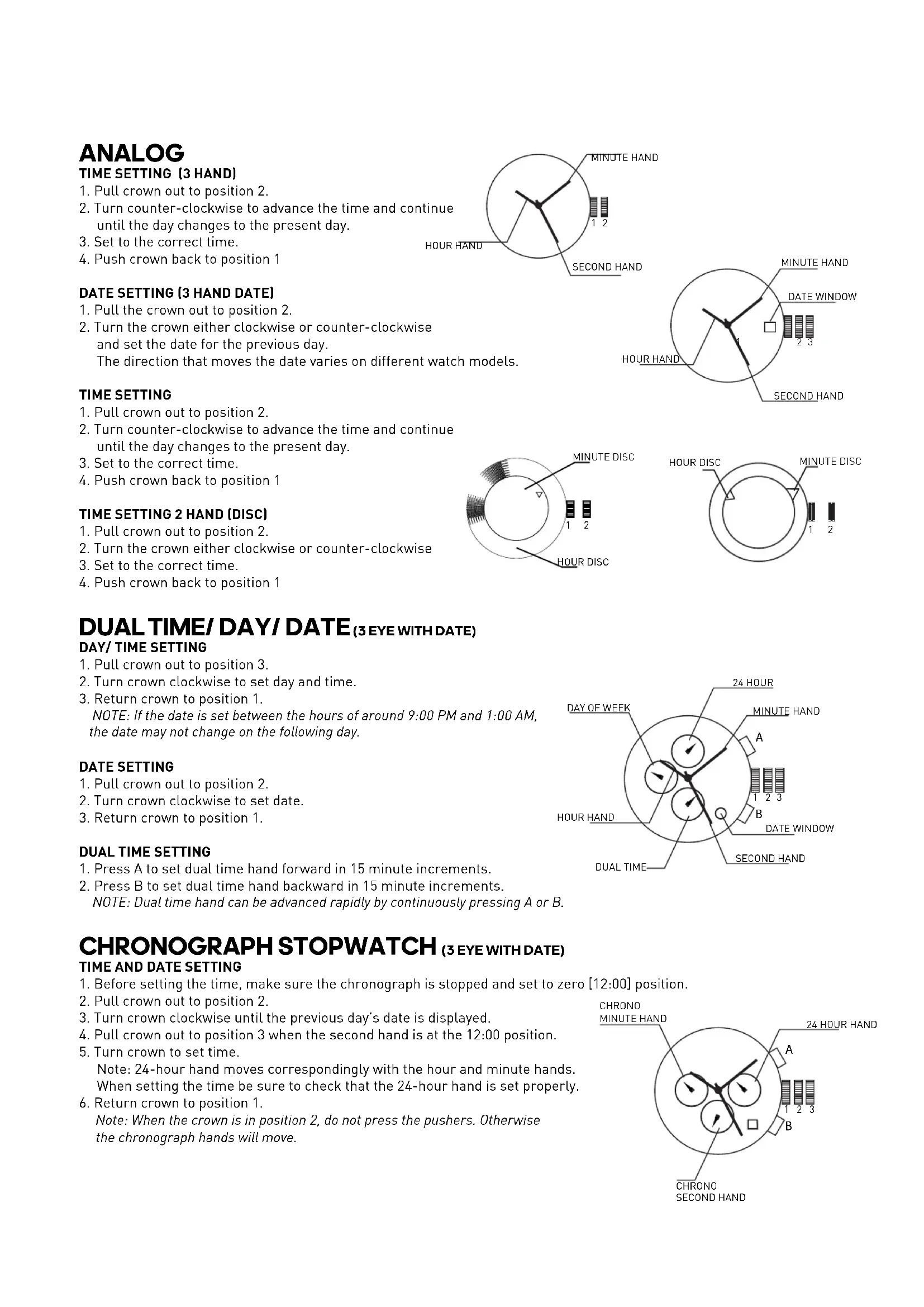 Note: When the crown is in position 2, do not press the pushers. Otherwise the chronograph hands will move. HOUR DISC MINUTE DISC HOUR DISC MINUTE DISC